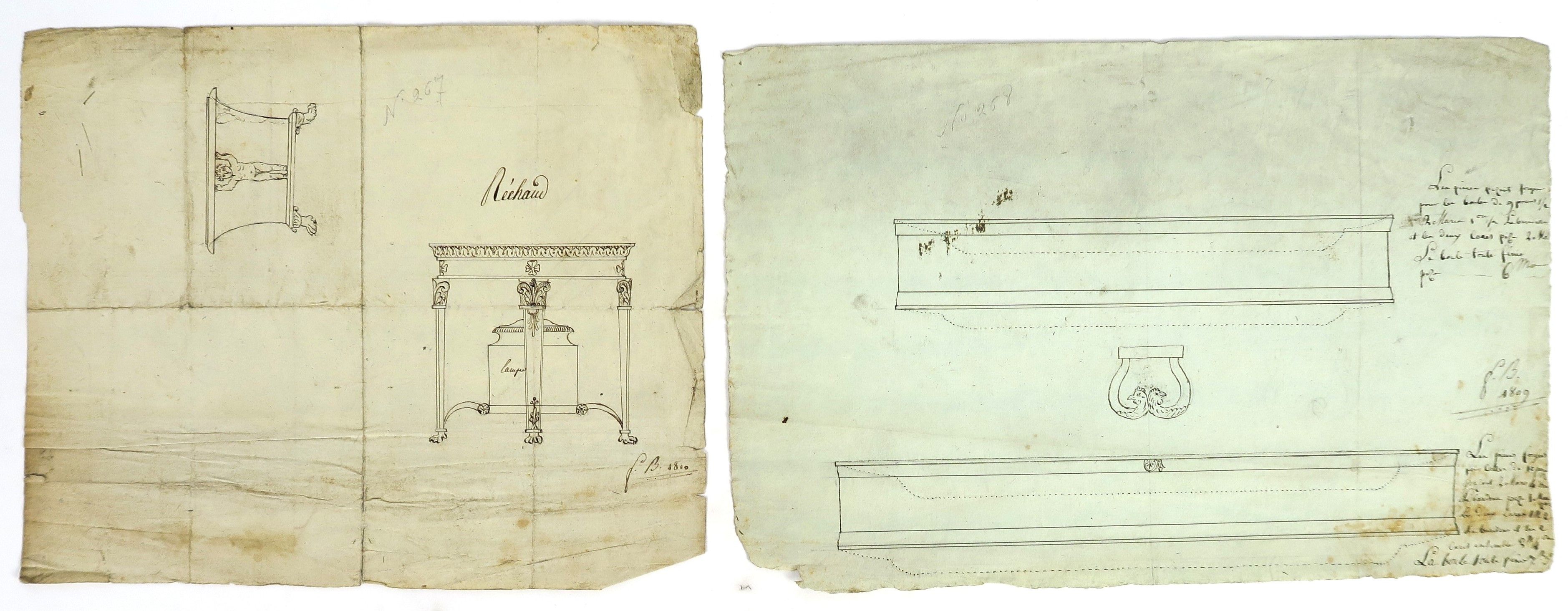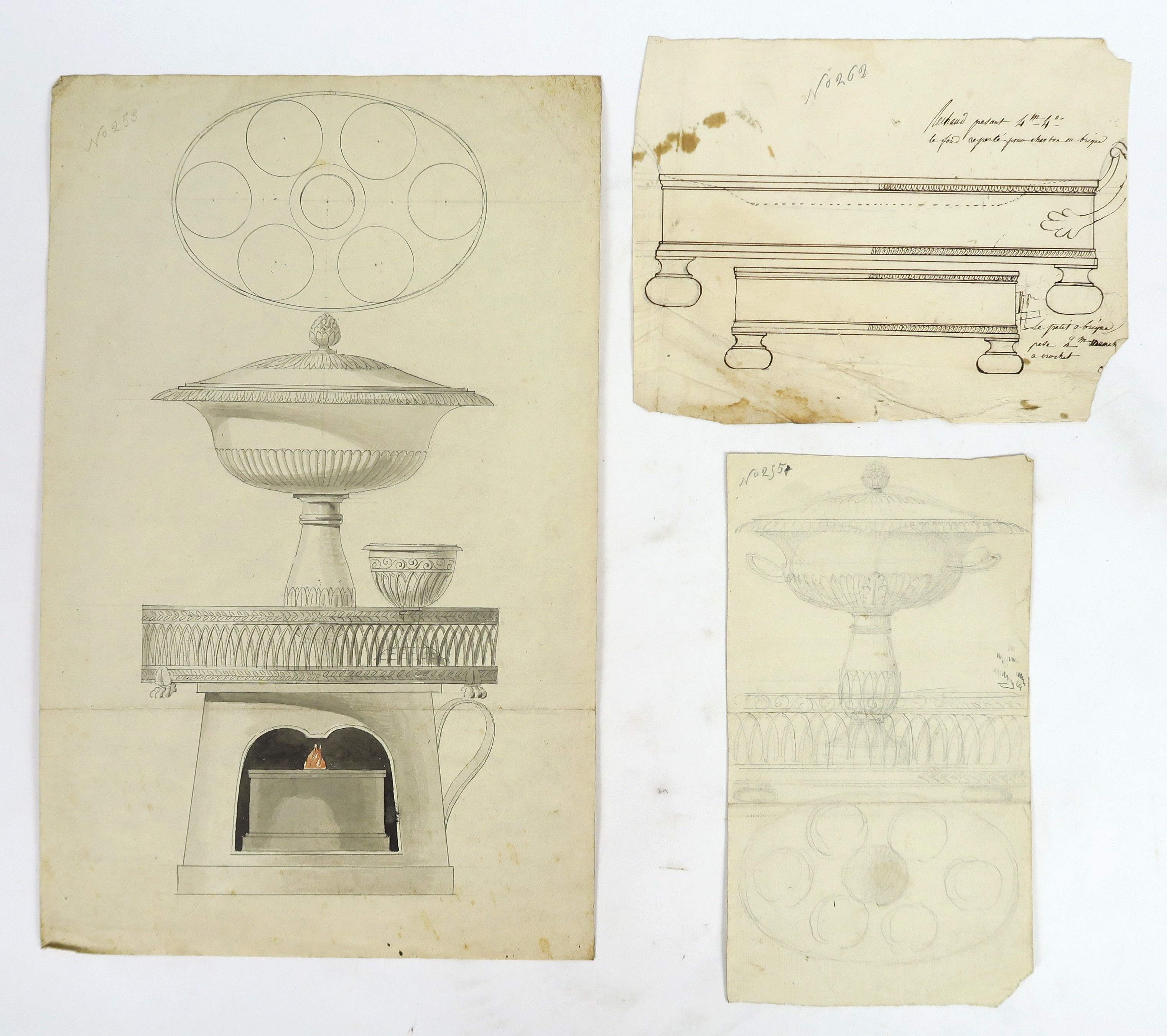 Bertrand PARAUD « Projets pour des réchauds » Ensemble de deux dessins. Signés. 24.5 x 37.5 cm 25 x 30 cm (pliures et légers accidents) Ecole française XIXème « Projets pour réchauds » Ensemble de trois dessins à la plume, aquarellé, au crayon. (états et dimensions divers)