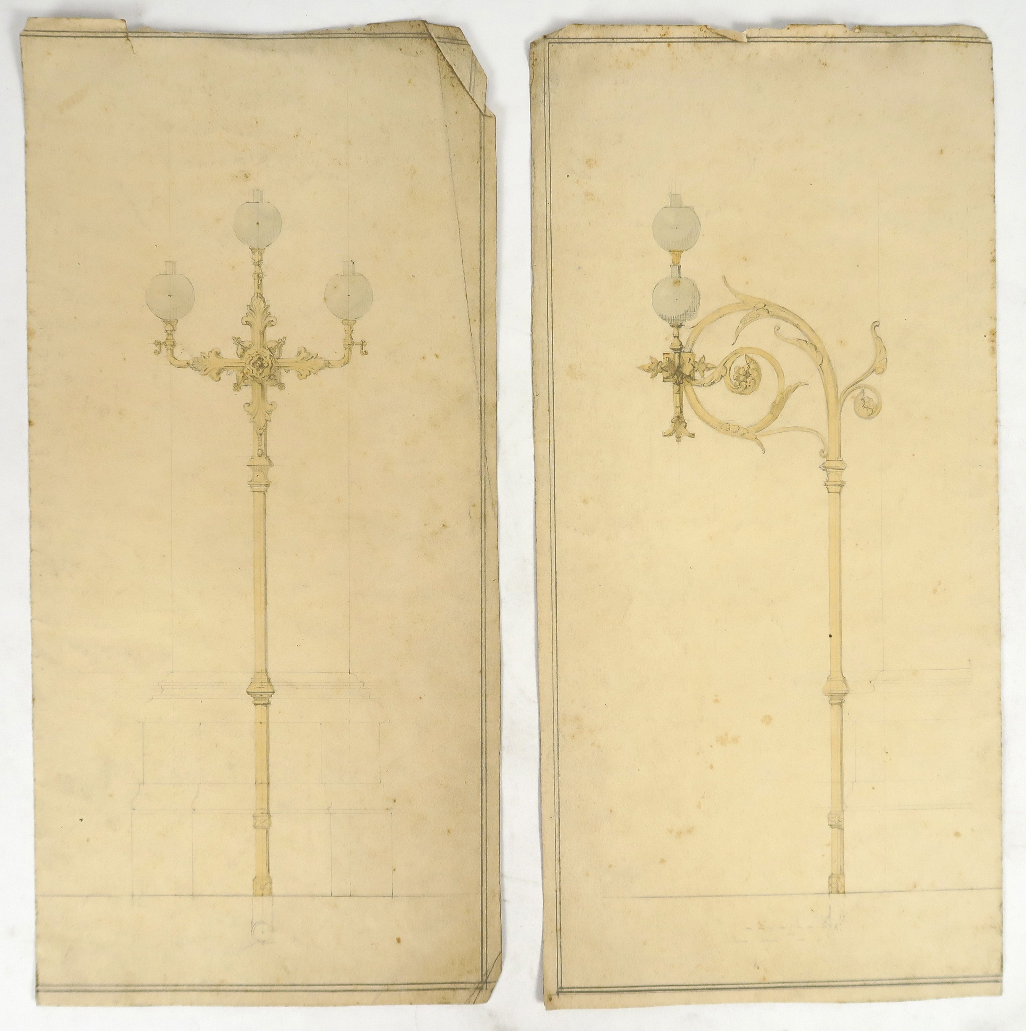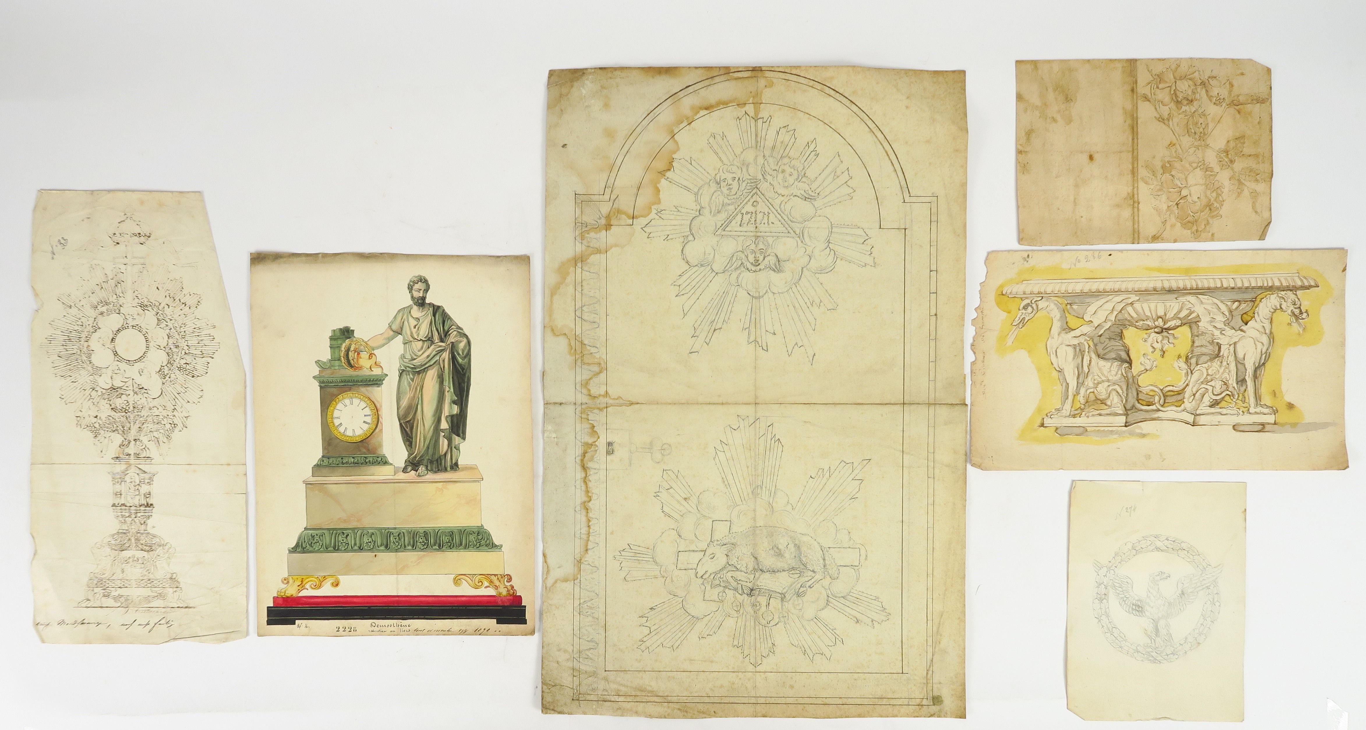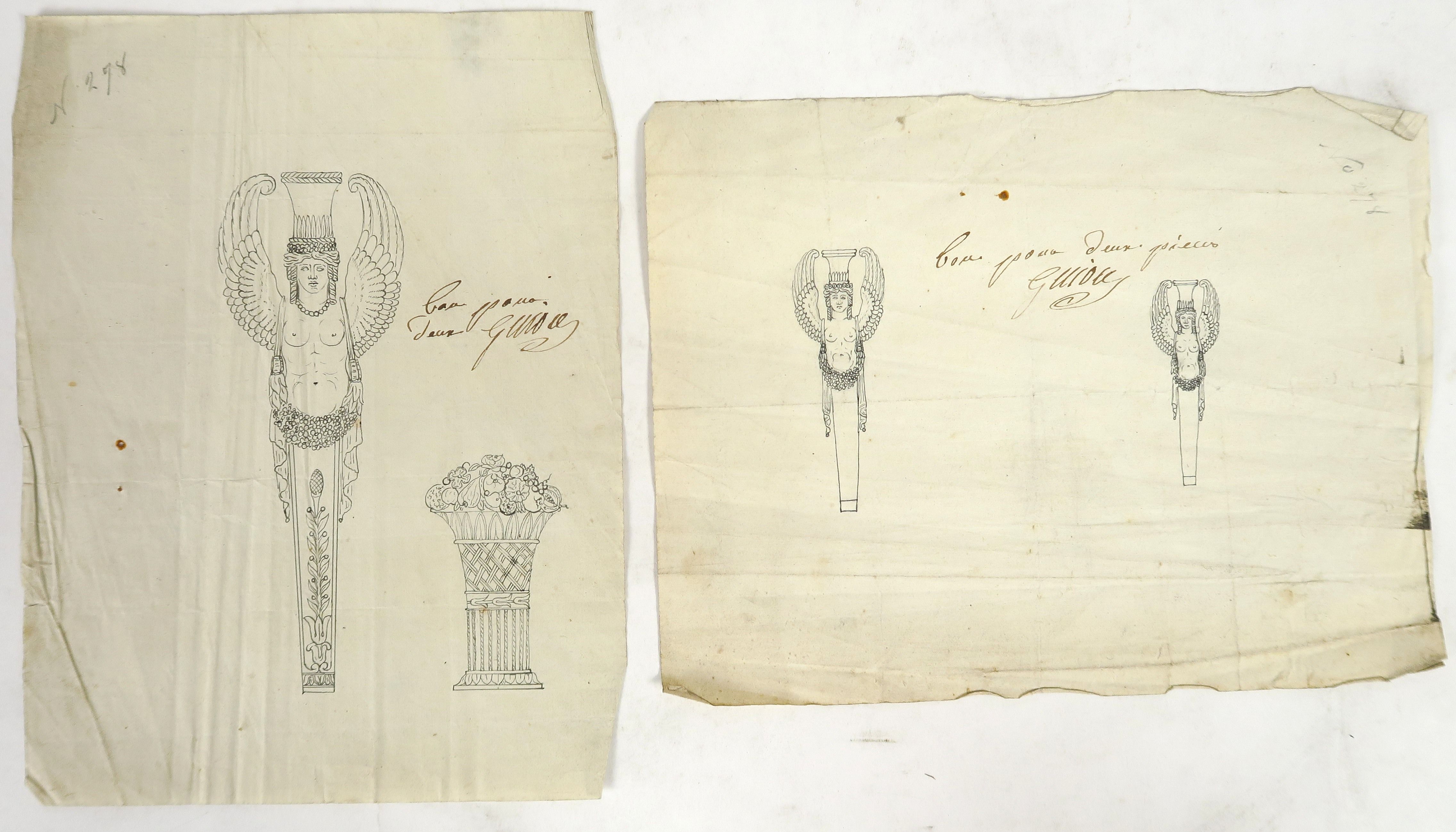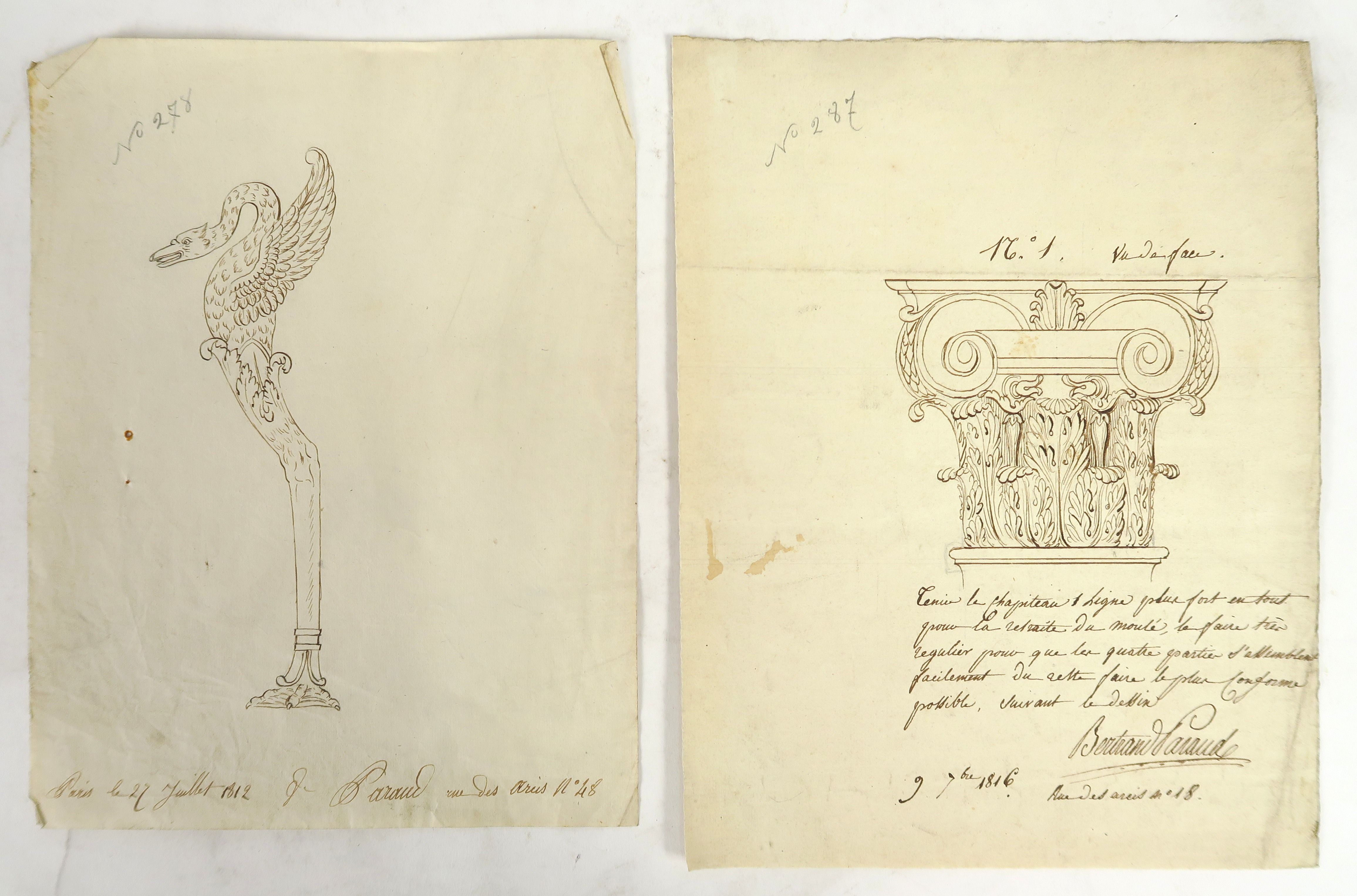 Betrand PARAUD orfèvre « Deux différents projets » Dessins. Signés. L’un daté 1812 et l’autre 1816. 24 x 18.5 et 25.5 x 19.5 cm GUIOU « Deux différents projets « Dessins. Signés. 18.5 x 24 cm et 24 x 18.5 cm (légères pliures) On y joint un ensemble de dessins XVIIIème, XIXème ou XXème pour différents projets (états et dimensions divers)