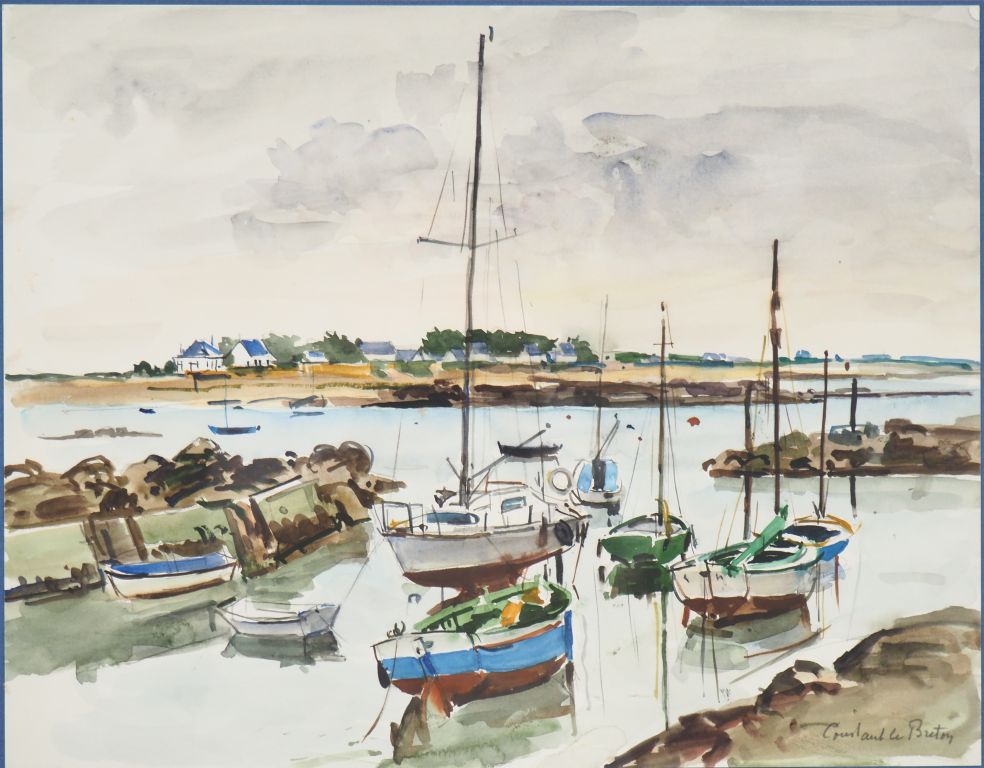 Constant LE BRETON. "Barques de pêche au mouillage". Aquarelle, signée en bas à droite. Dim. 32 x 41 cm.