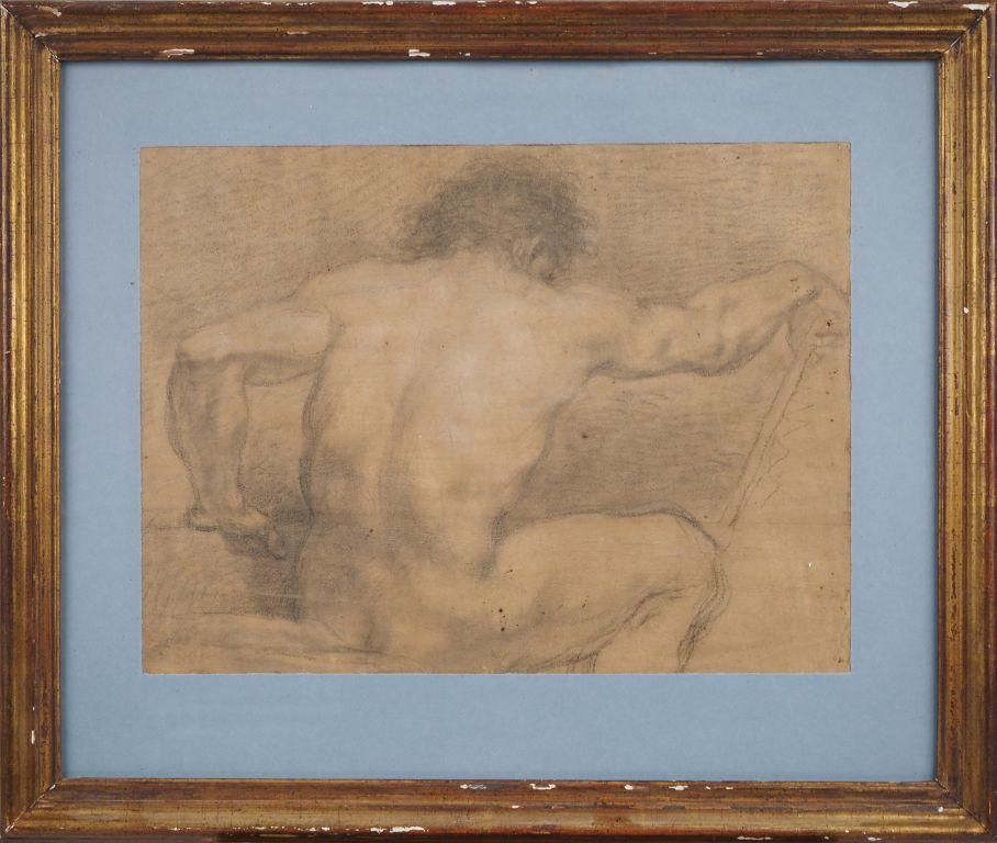 Ecole bolonaise XVIIème. "Etude d'homme nu, assis de dos" Dessin au fusain Dim. 27,5 x 36 cm