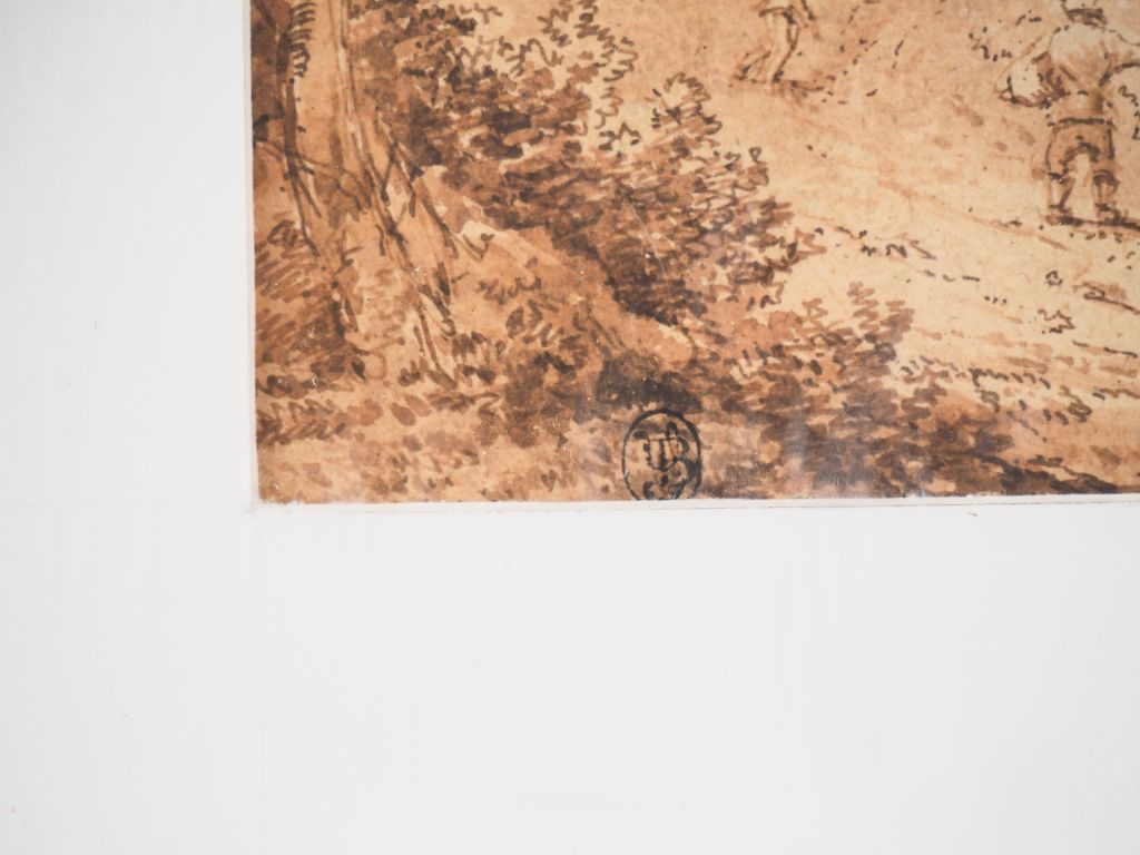 Ecole du Nord vers 1800. "Bergers et leur troupeau au bord du rivage". Dessin, porte un monogramme en bas à gauche. Dim. 15,5 x 22 cm.