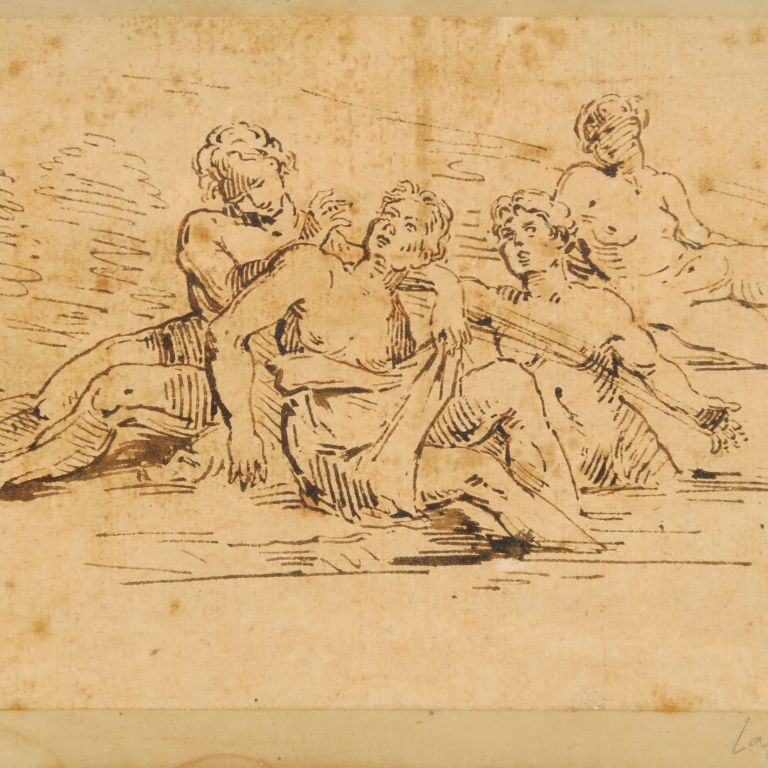 Ecole française début XIXe. "Nymphes dans un bassin". Dessin à la plume. Dim. : 13 x 20,5 cm.