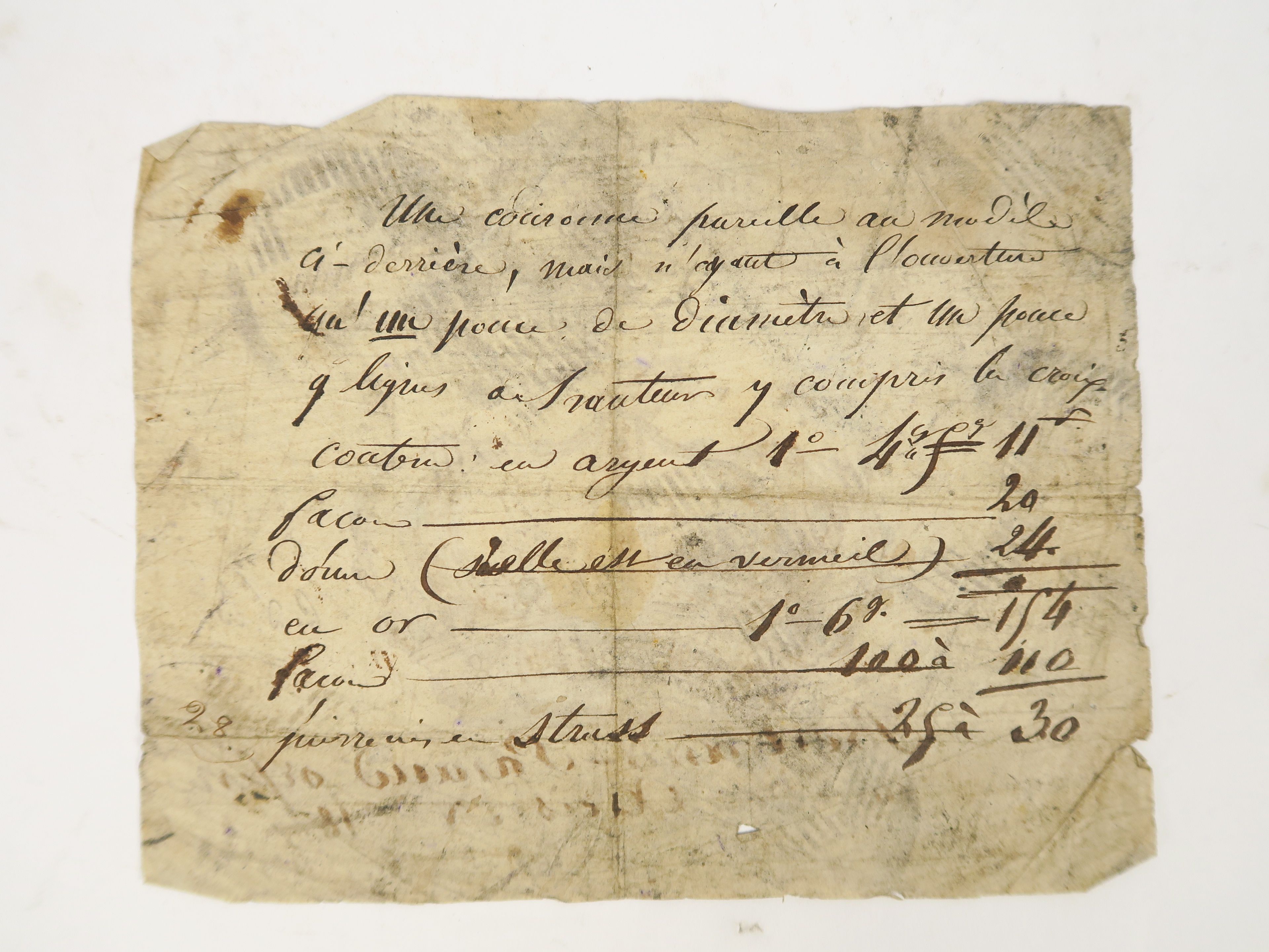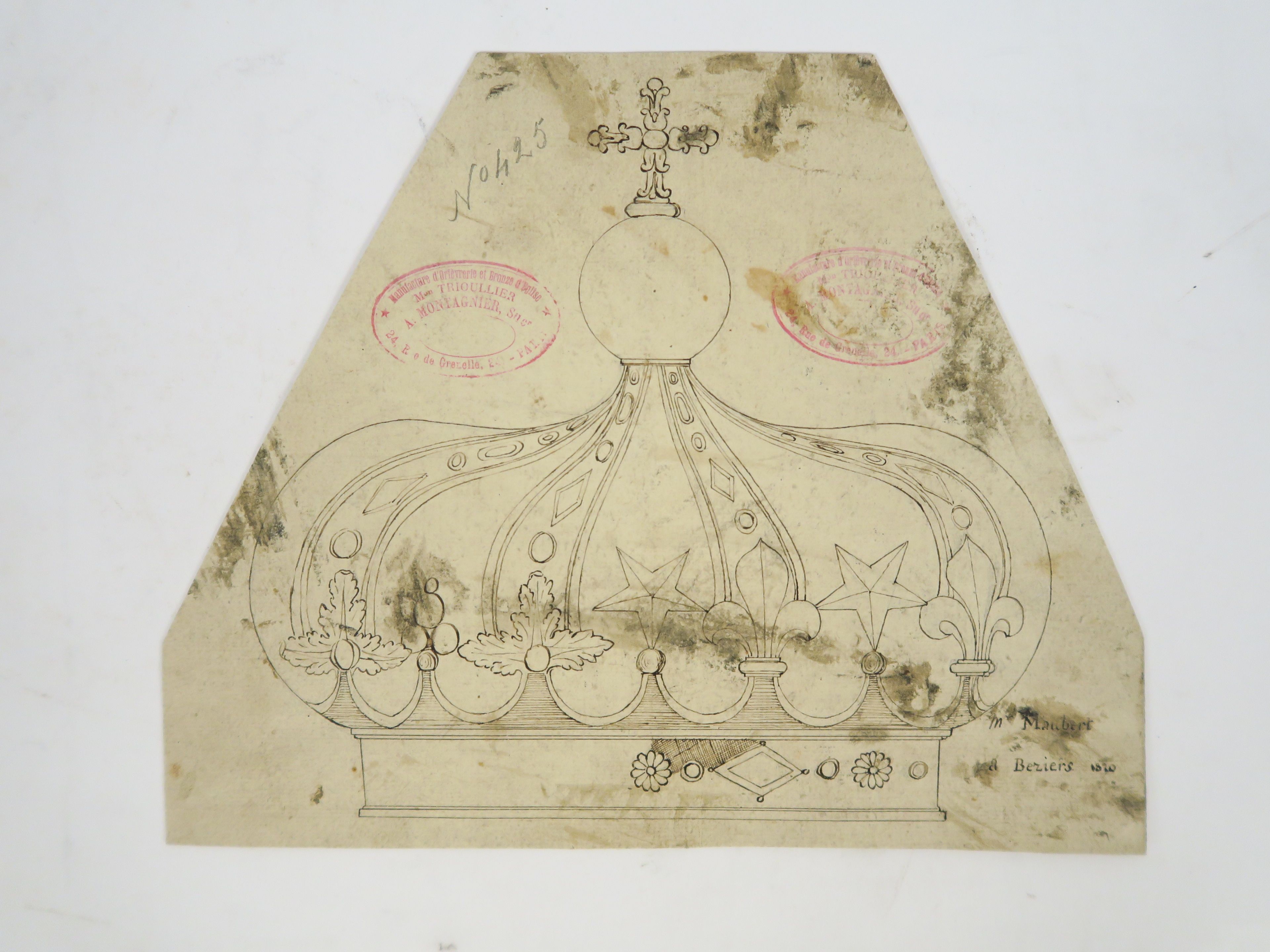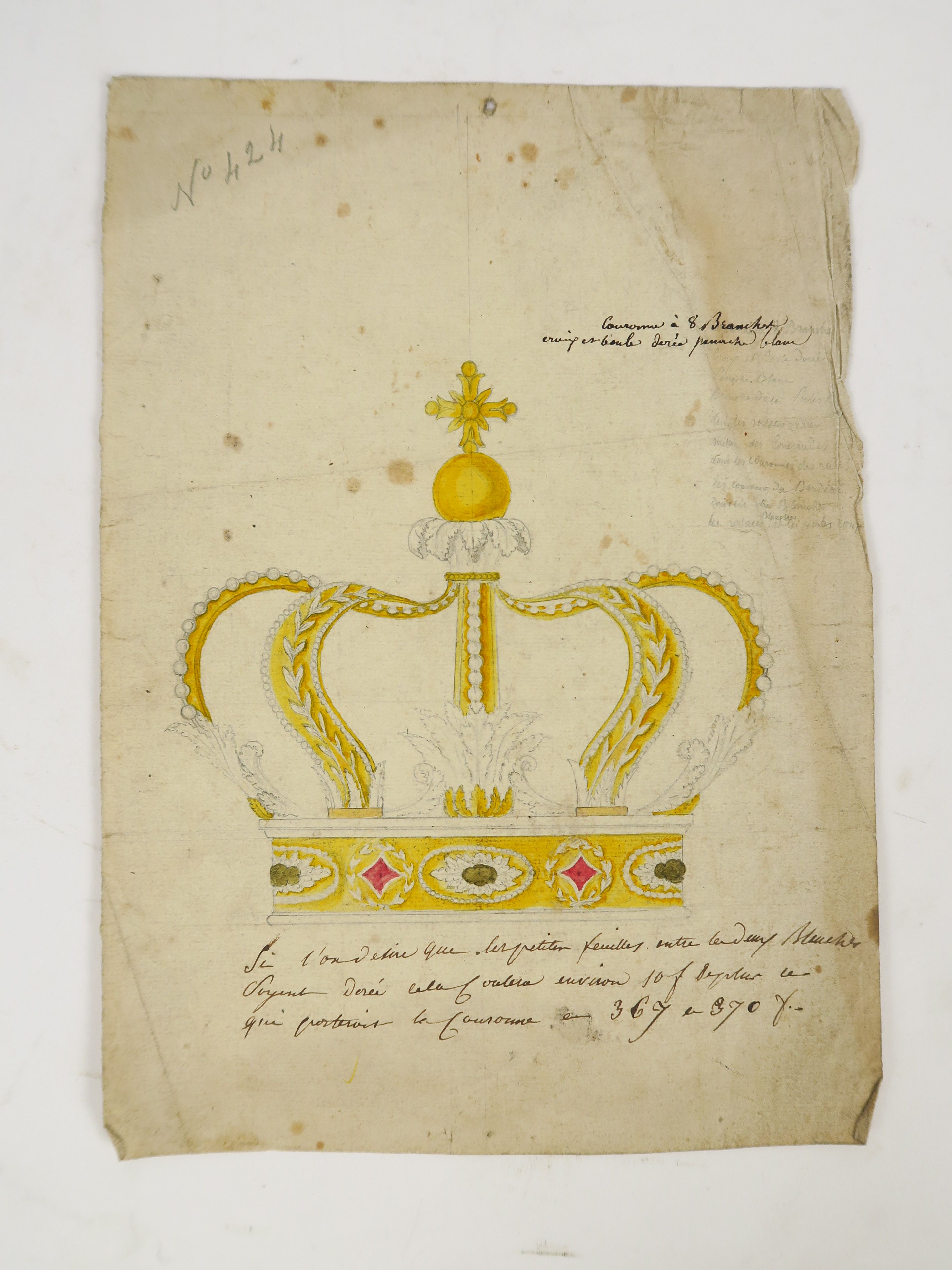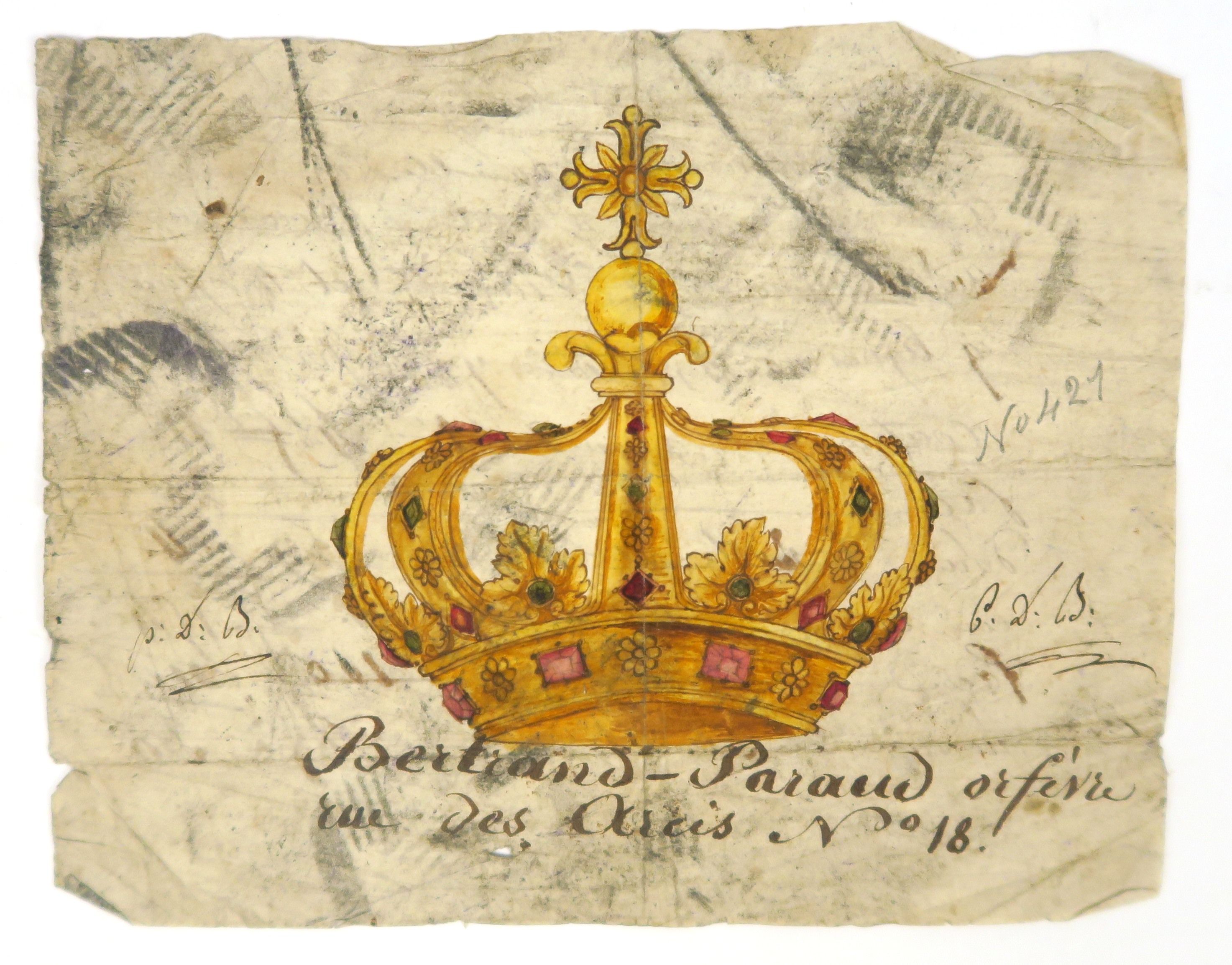 Ecole française début XIXème « Projet de couronne à 8 branches » Dessin aquarellé. 27.4 x 19.5 cm (piqûres) On y joint un ensemble de 8 projets de couronne. Dessins, dessins aquarellés, dessins à la sanguine. Dont : - Bertrand PARAUD orfèvre « Projet de couronne » Dessin aquarellé. Signé. 15 x 18.5 cm - A. MONTAGNIER, successeur de TRIOULLIER « Projet de couronne » Dessin sur papier cartonné. Signé du tampon de l’atelier et daté 1820. Projet pour Monsieur Maubert à Béziers. H. 21 cm - Ecole française « Projet pour trois couronnes en vermeil » Dessins sur papier cartonné. Porte les inscriptions « n°1. Louis XVI, n°2. Marie-Antoinette, n°3. Louis XVII » et « couronne ducale blanche mgr Duc de Berry » au recto. Porte l’inscription « Couronne vermeil pour Sa Majesté Louis XVIII » au verso. 41.5 x 30.5 cm (quelques taches et accidents)