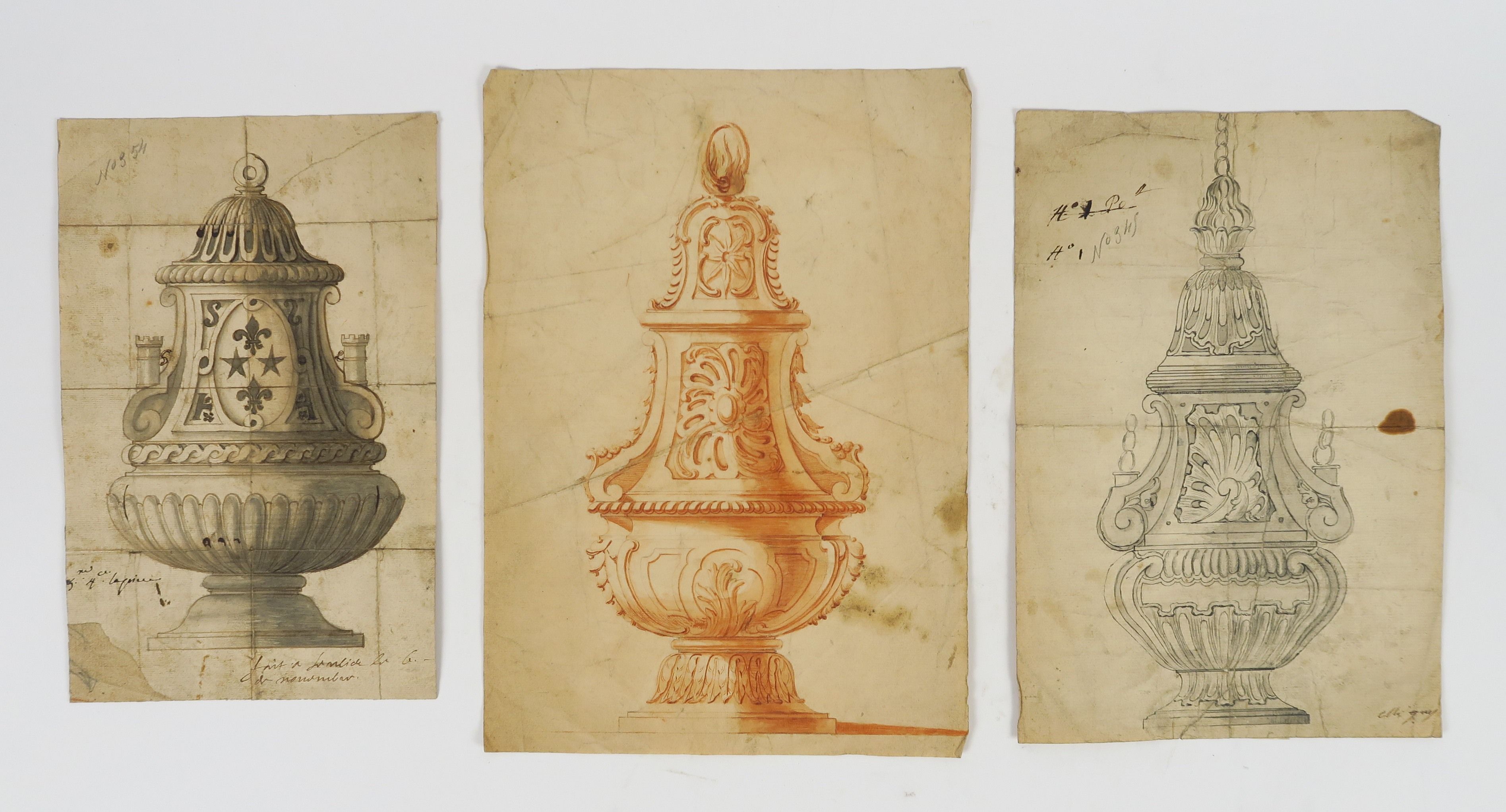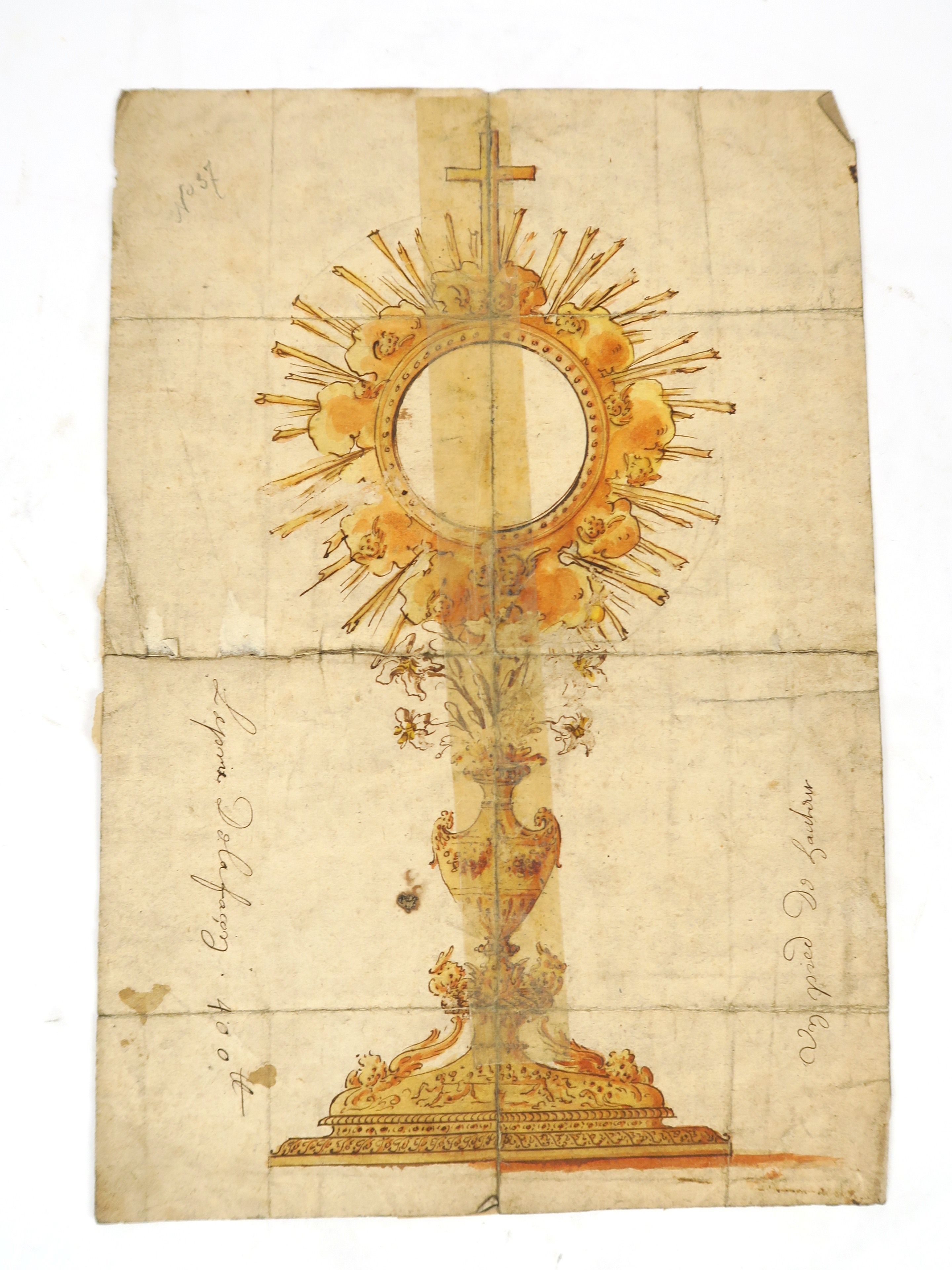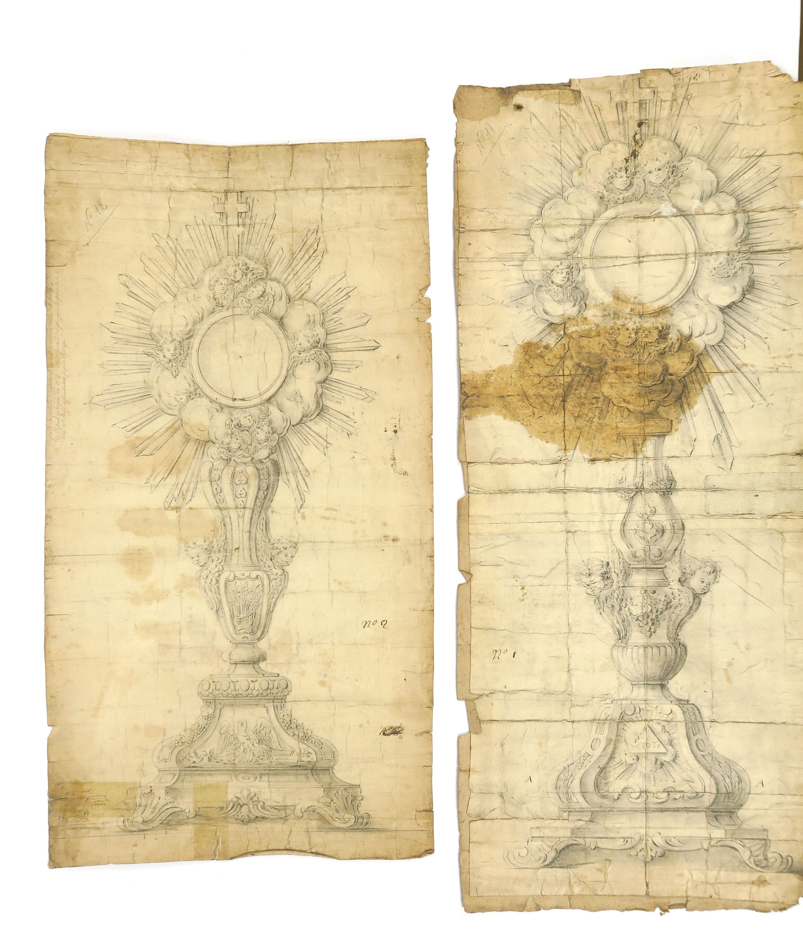 Ecole française début XIXème « Projet d’ostensoir » Dessin au lavis et aquarellé. 41.5 x 27.5 cm (accidents) On y joint - un ensemble 3 projets d’ostensoirs Dessins et dessin aquarellé. 67.4 x 28.5 cm - 59 x 31 cm - 34.2 x 23.5 cm - un ensemble de 10 projets d’encensoirs, certains XVIIIème. Dessins au lavis et à la sanguine. Dont PARAUD.