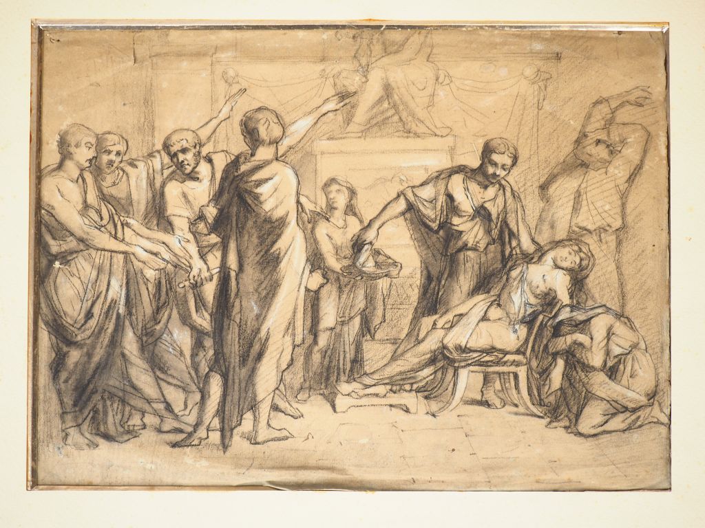 Ecole française Néoclassique. "La mort de Lucrèce". Dessin, porte une signature apocryphe dans un cartouche. Dim. 26 x 39,5 cm. (Pliures sur les bordures).