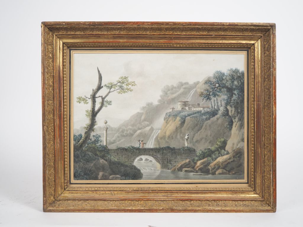 Ecole française ou italienne début XIXème. "personnage cheminant sur un pont dans un paysage à la cascade" Aquarelle Dim. 23 x 31,5 cm