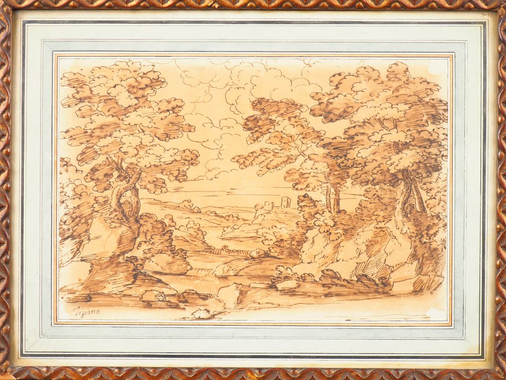 Ecole française ou italienne XIXème. "Paysage". Dessin signé "Tiziano" en bas à gauche. Dim. 21,5 x 32 cm.