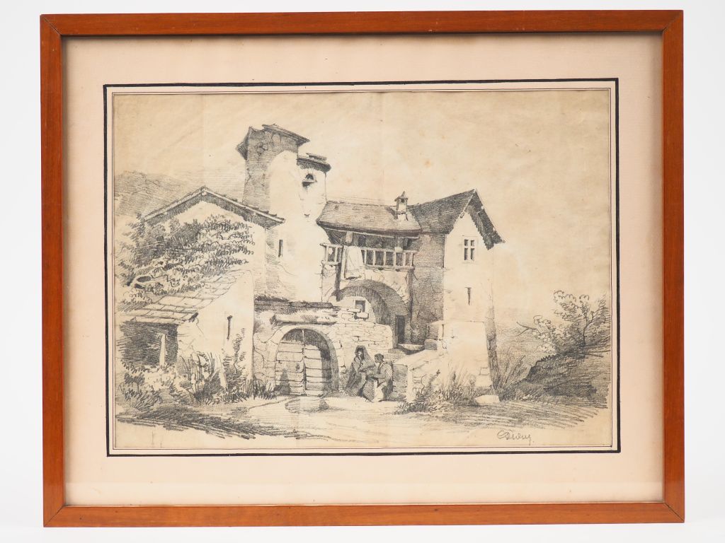 Ecole française XIXème. "Discussion dans l'escalier". Dessin au crayon signé en bas à droite. Dim. 25 x 35 cm. (pliure et petites rousseurs)