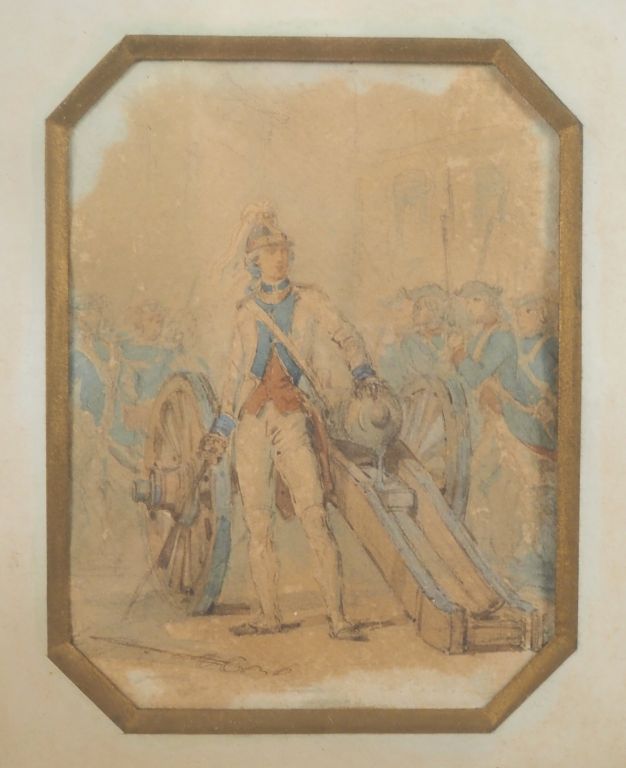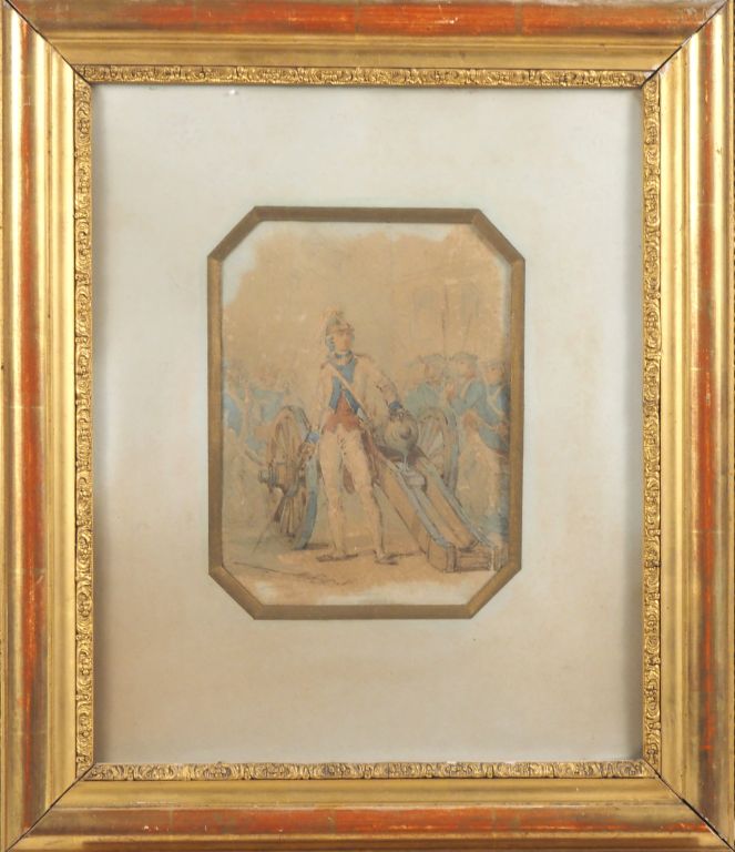 Ecole française XIXème. "officier artilleur" Aquarelle, signée en bas à gauche Dim. 19,5 x 14,5 cm (insolée)