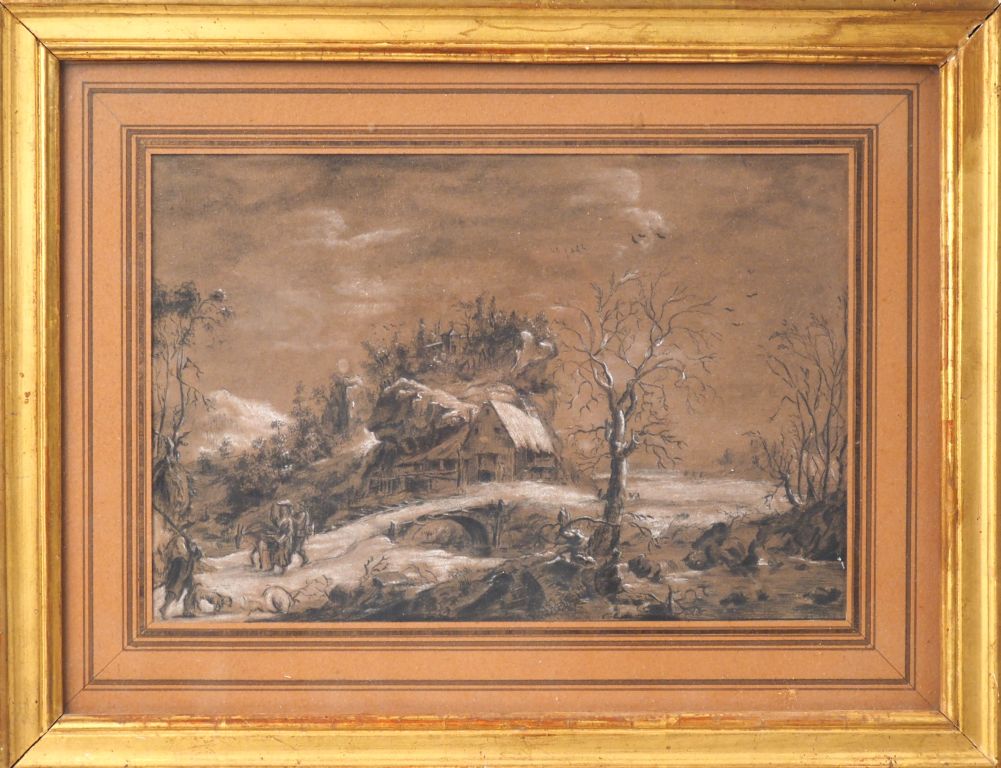 Ecole française XIXème. "Paysage d'hiver à la chaumière" Dessin au crayon rehaussé à la craie. Dim. 17 x 26 cm.