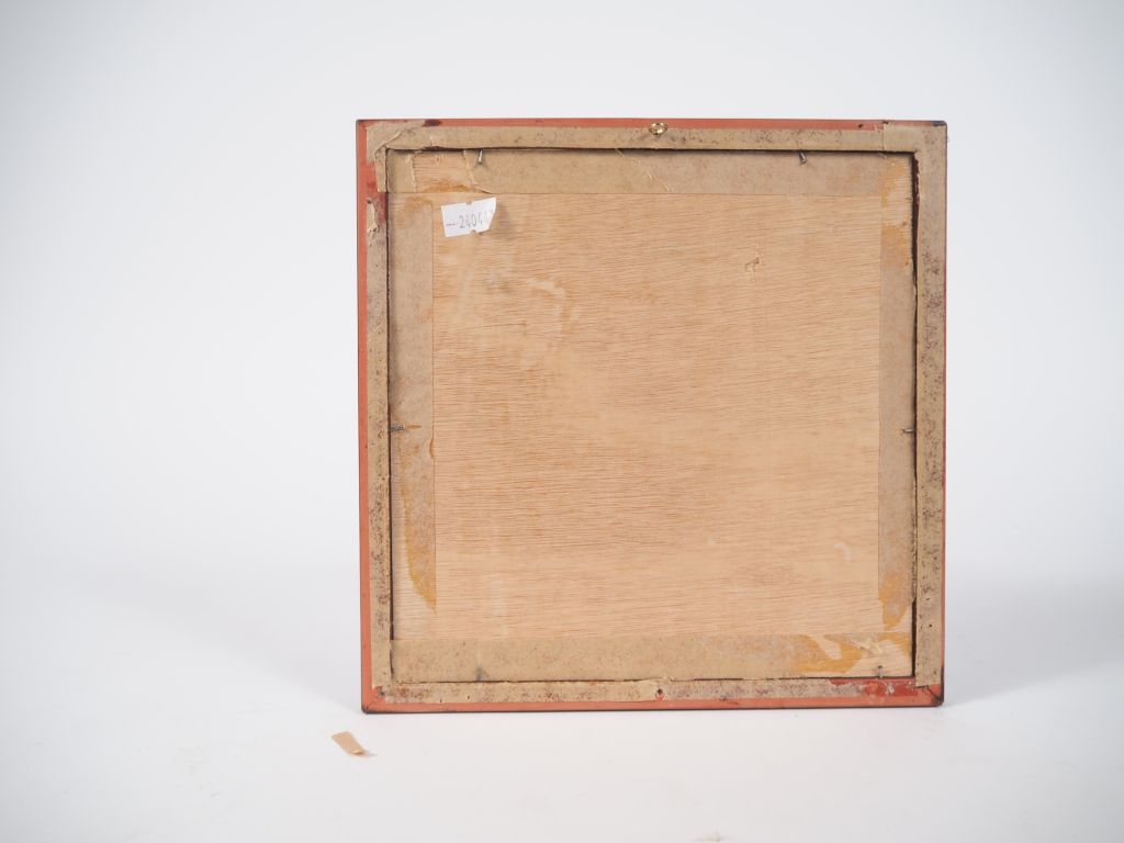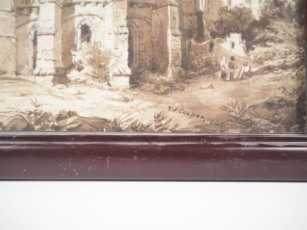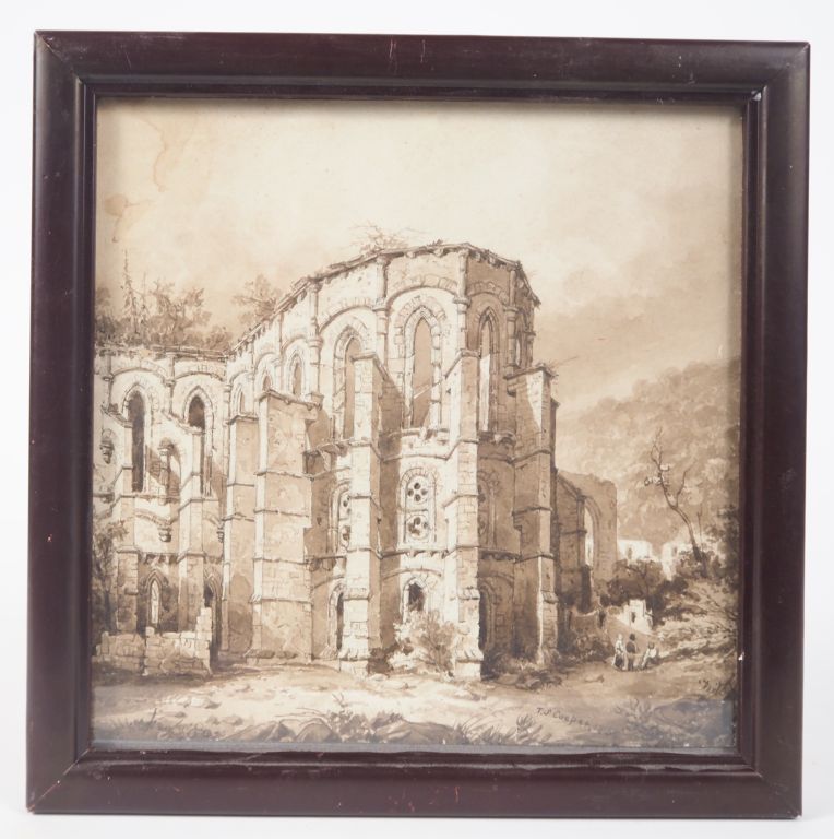 Ecole française XIXème. "personnage devant le clocher d'une église en ruines" Lavis signé en bas à droite et daté 1834 Dim.20 x 20 cm