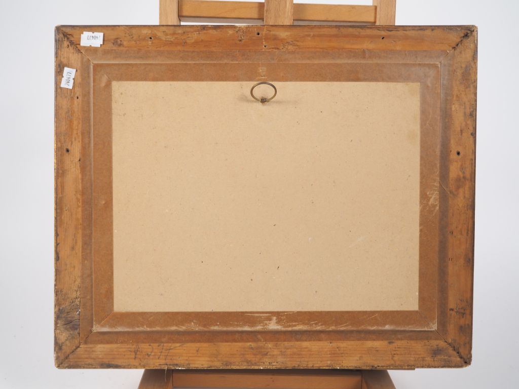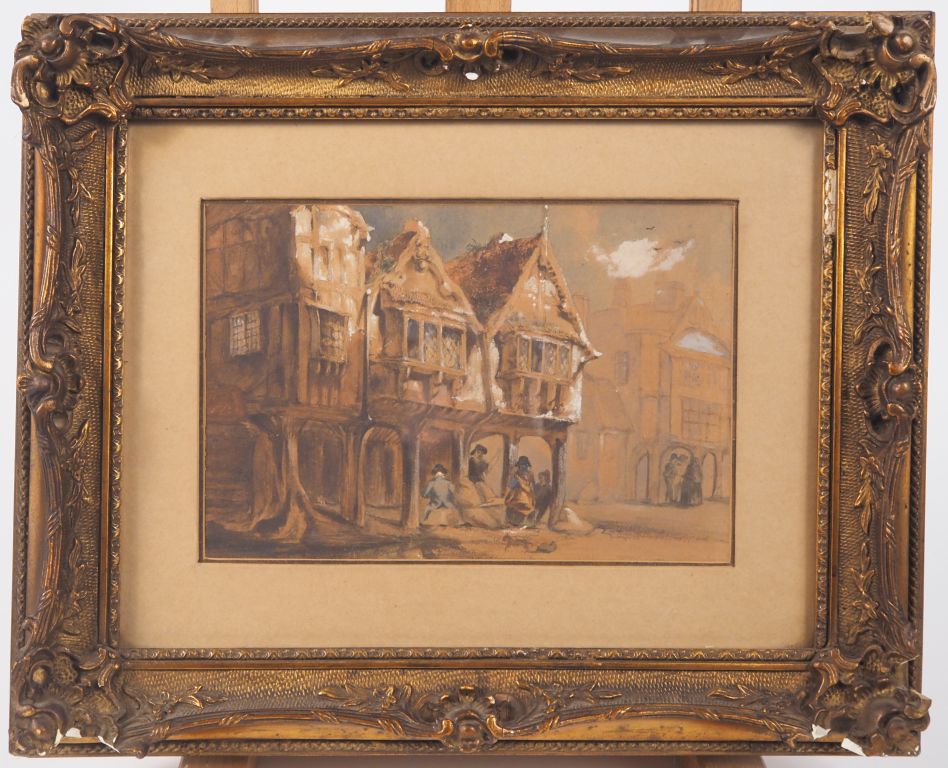 Ecole française XIXème. "personnages discutant sous les couverts d'un village" Aquarelle, rehauts de craie Dim. 17,5 x 25,5 cm