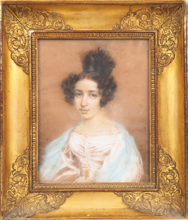 Ecole française XIXème. "Portait de jeune fille au chignon". Pastel. D...