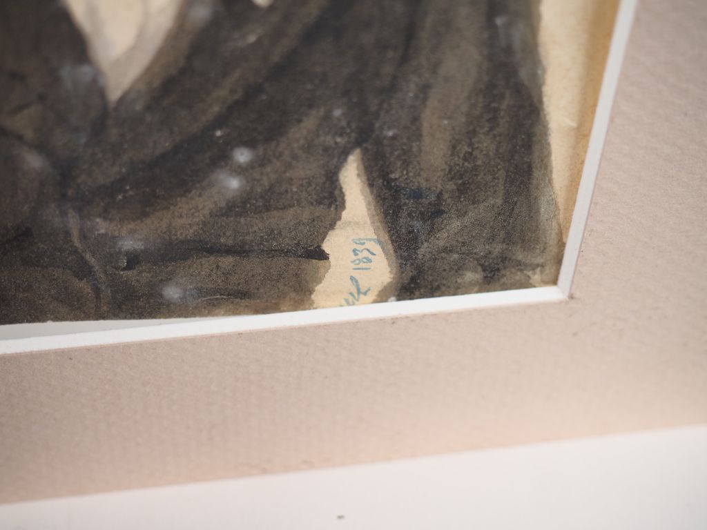 Ecole française XIXème. "Portrait de jeune homme au foulard". Aquarelle signée en bas à droite et datée 1839. Dim. 19,5 x 14,5 cm.