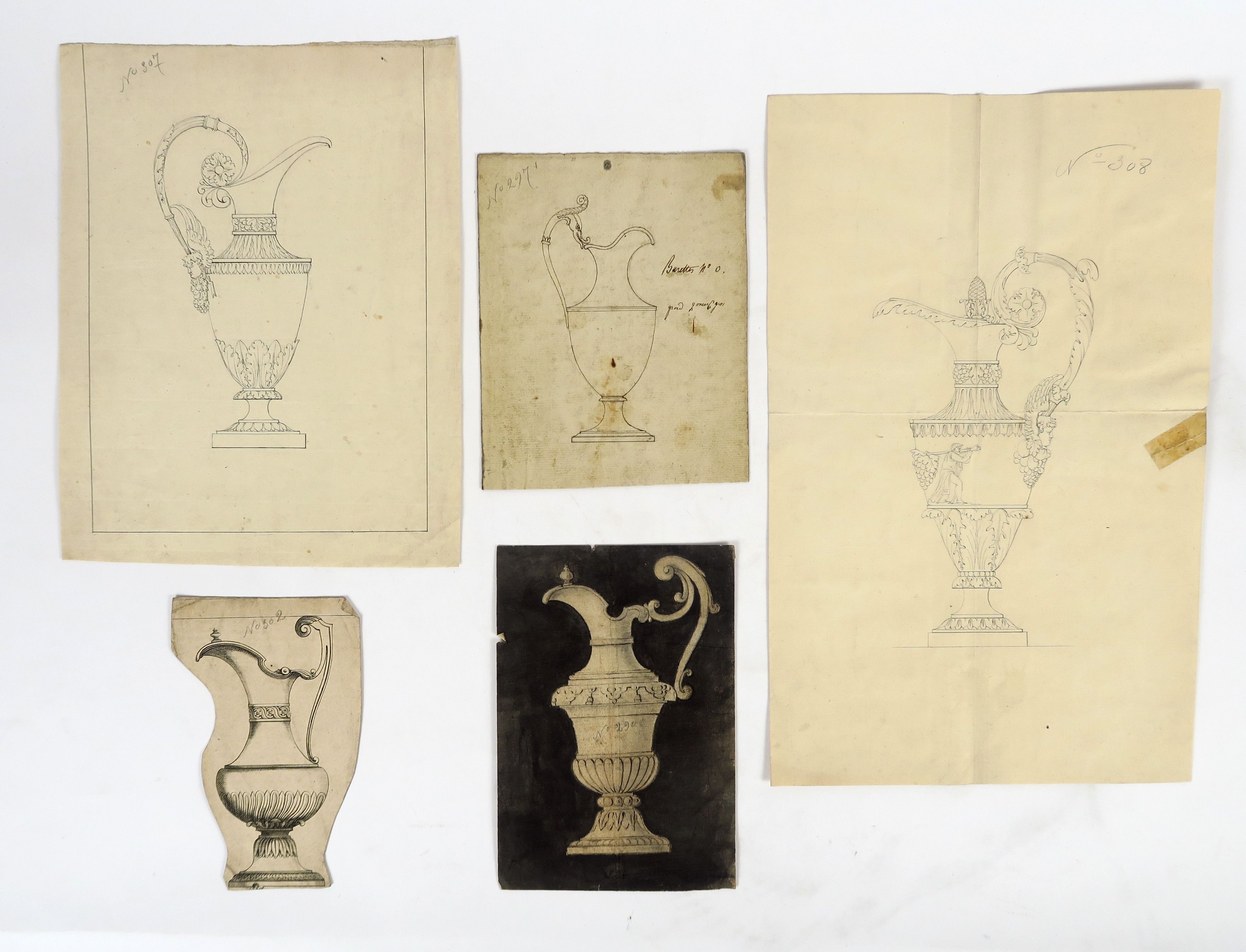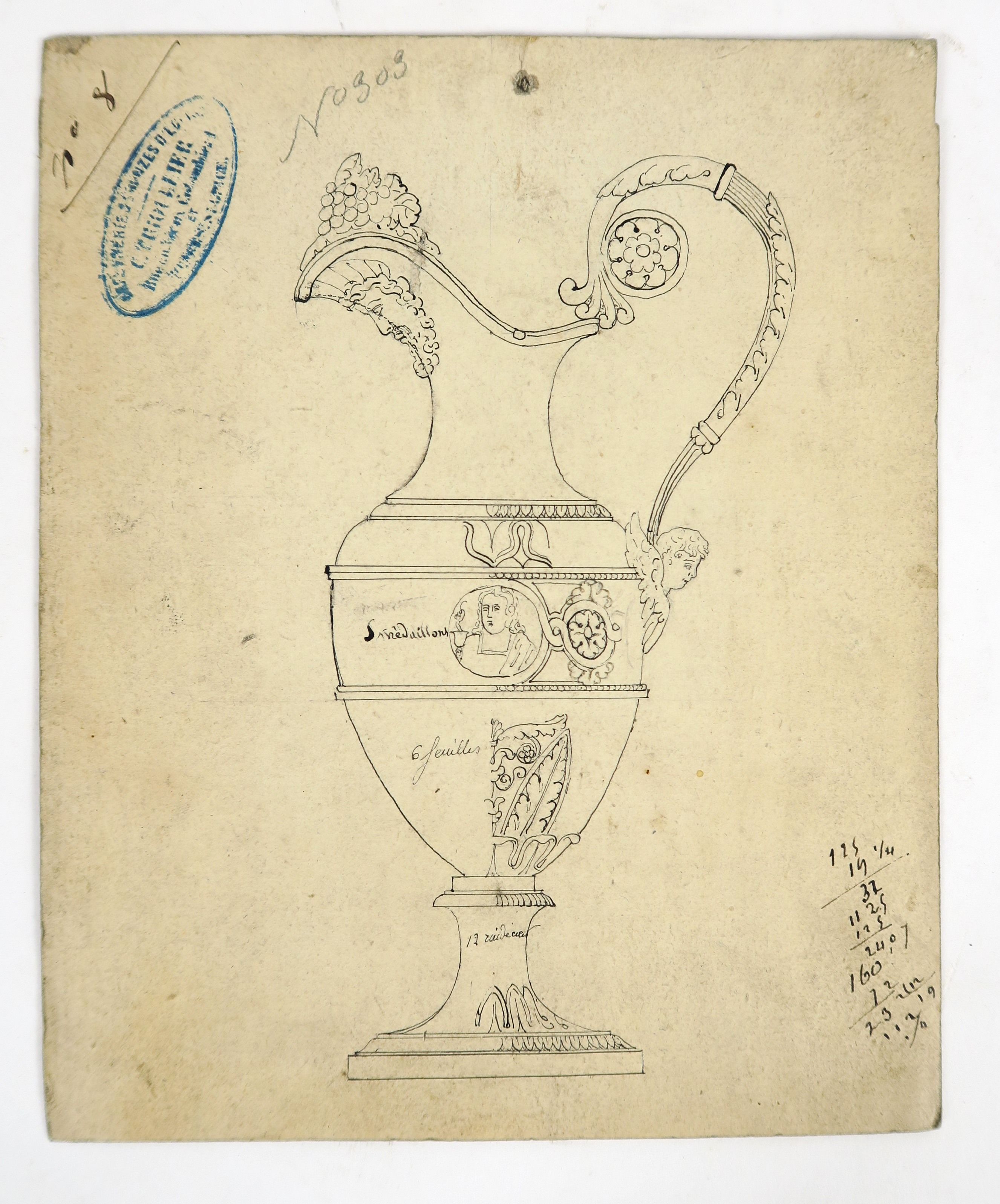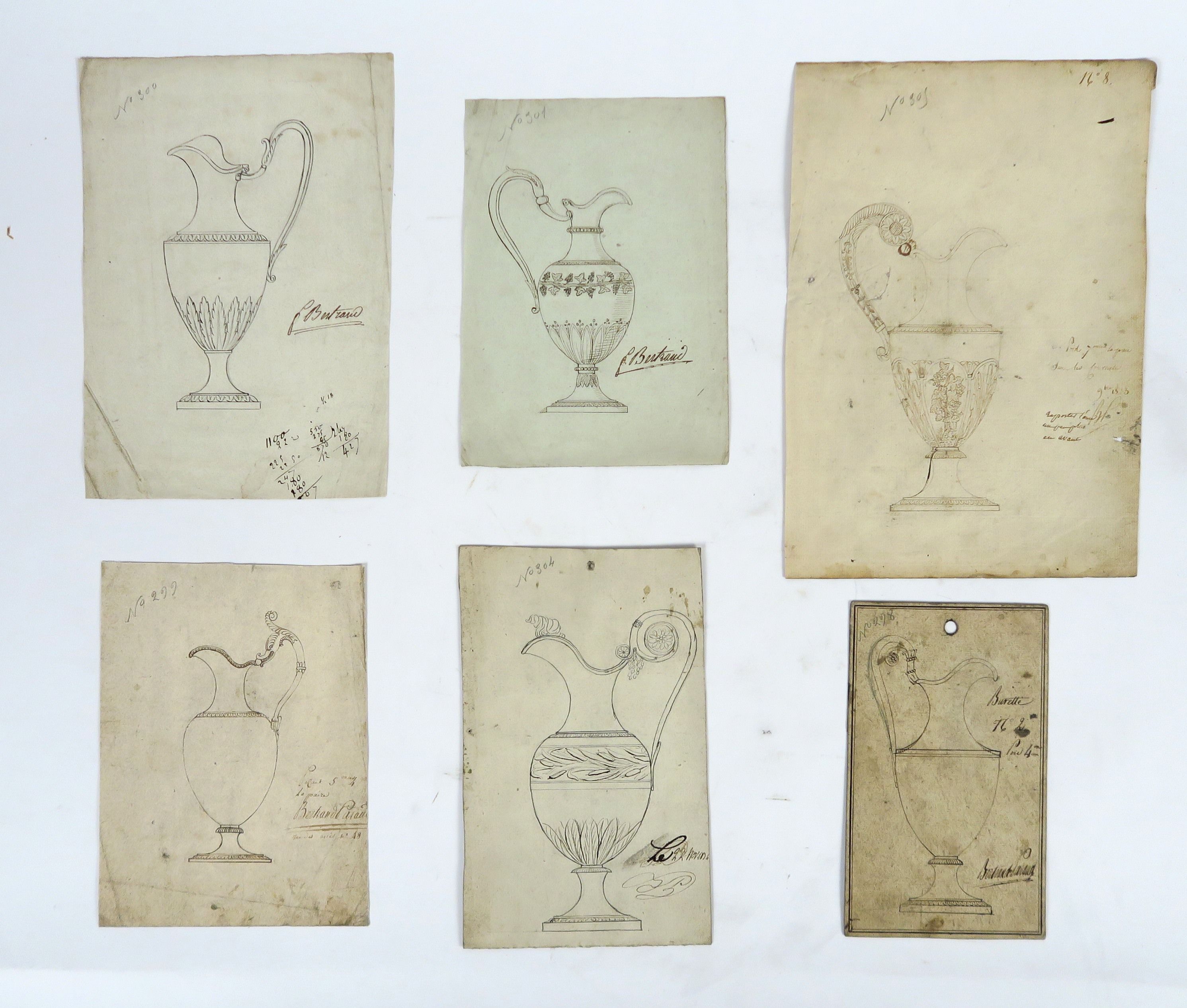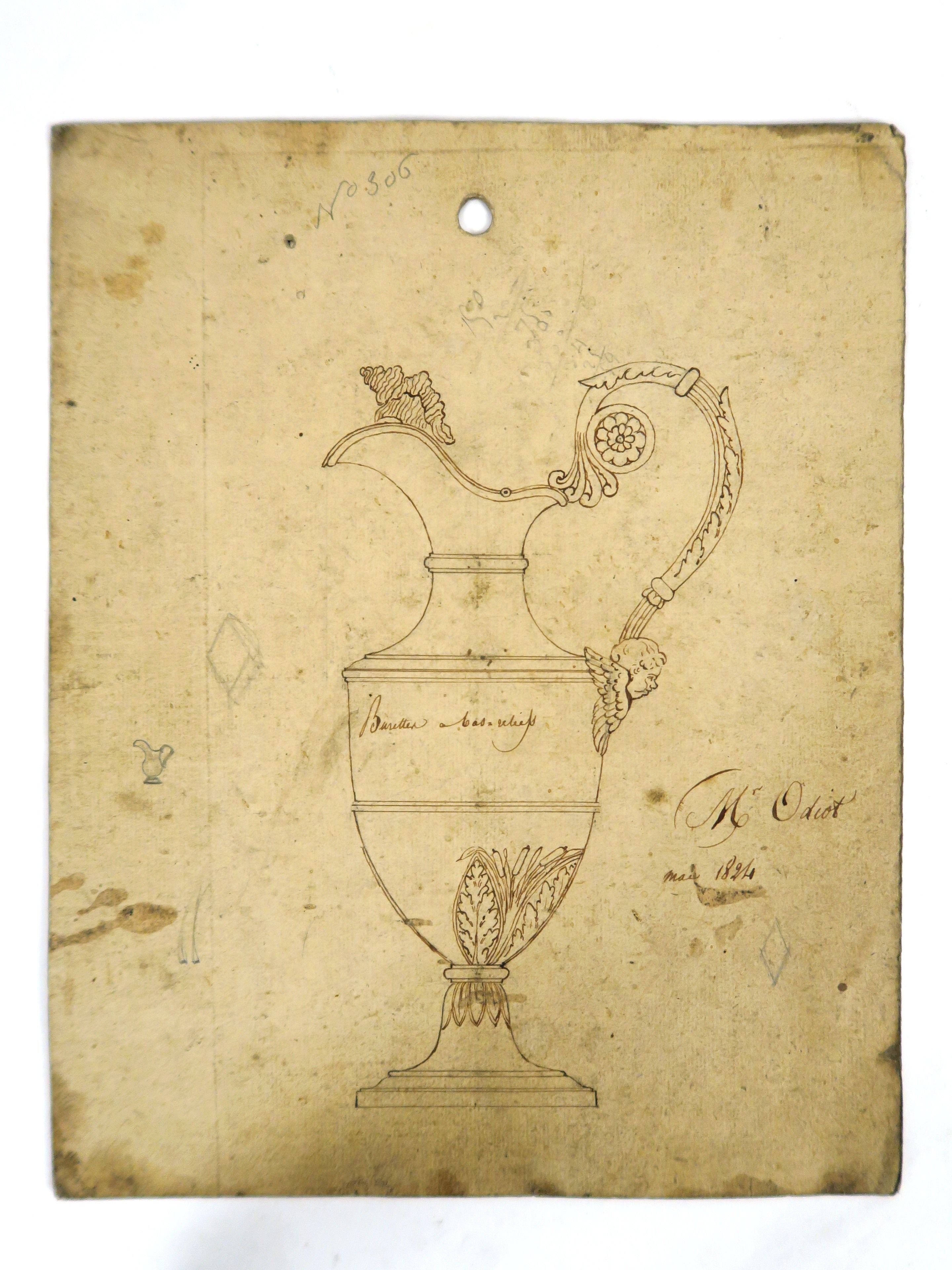 Ecole française XIXème « Projet de burette pour Monsieur ODIOT » Dessin à la plume sur papier cartonné. Daté mai 1824. 26.5 x 21 cm (quelques tâches) Bertrand PARAUD « Projet de burettes » Ensemble de 6 dessins sur papier ou papier cartonné. Signés. (états et dimensions divers) C. TRIOULLIER « Projet de burette » Dessin à la plume sur papier cartonné, signé du tampon de l'atelier 22.5 x 18.2 cm (quelques légères tâches) Ecole française XIXème « Projets de burettes et de plateaux » Ensemble de 9 dessins (dont deux pour le même projet) (états et dimensions divers)