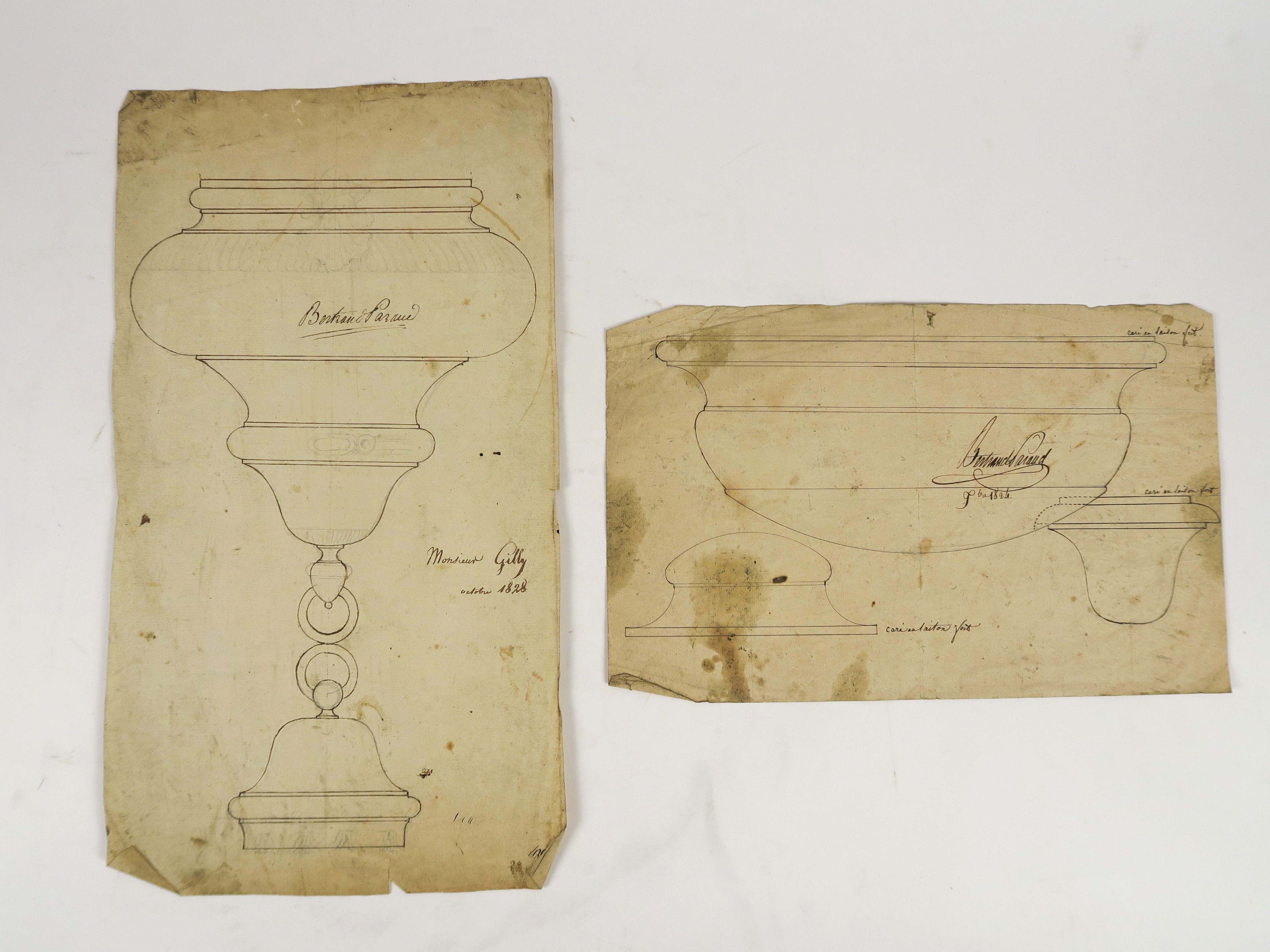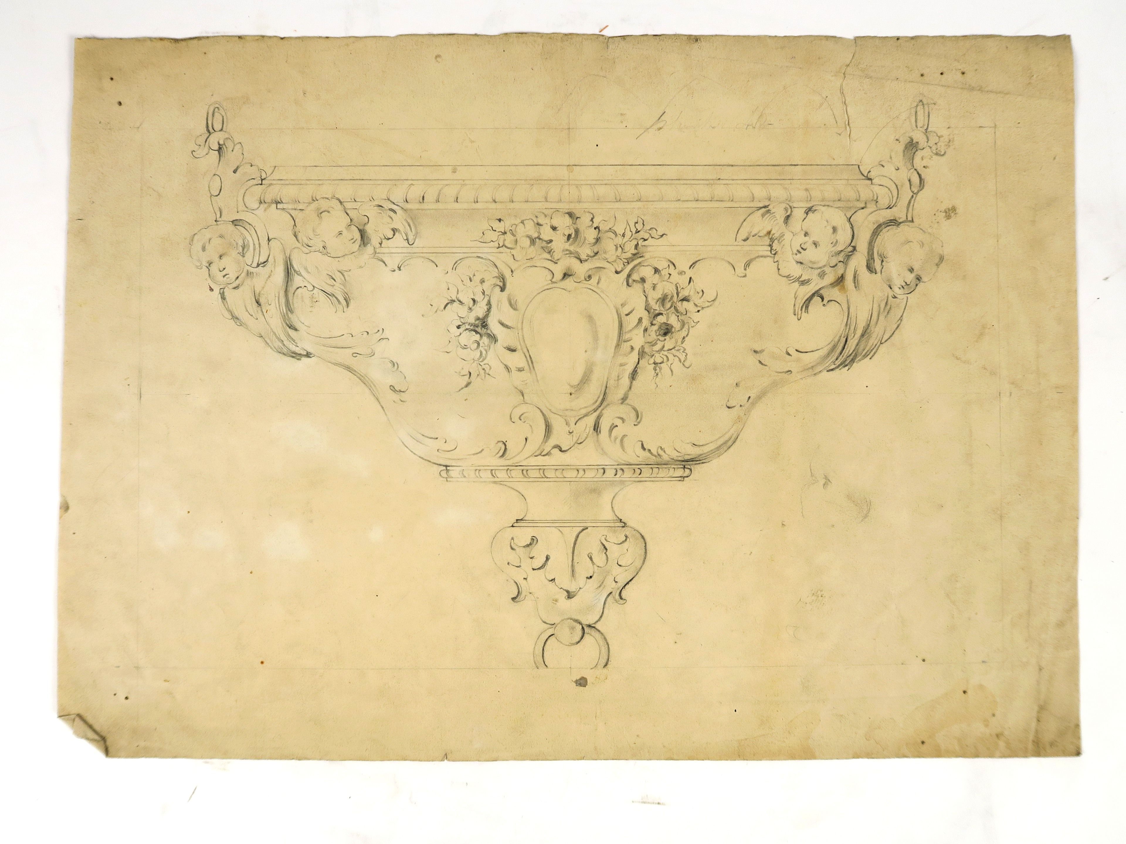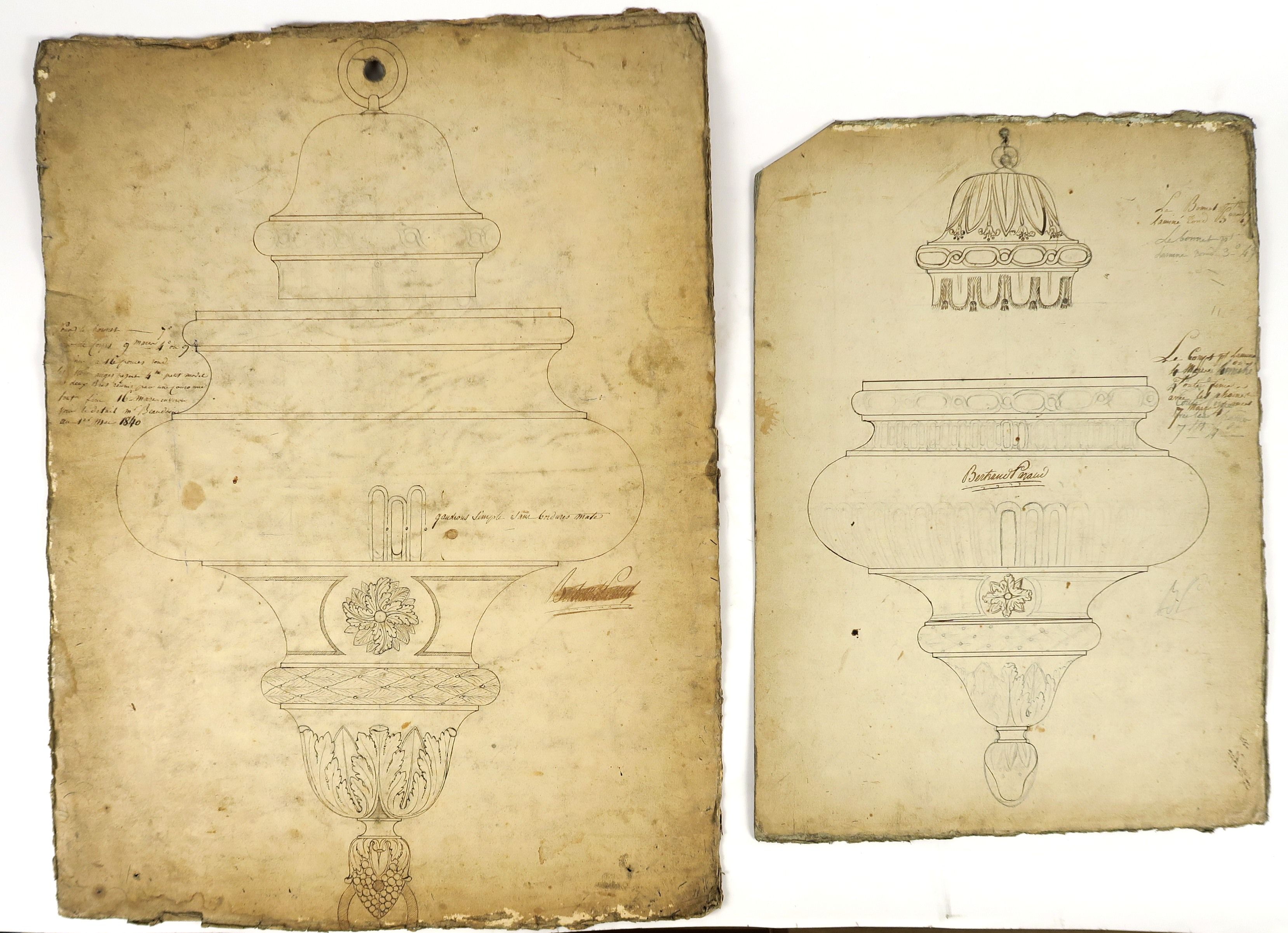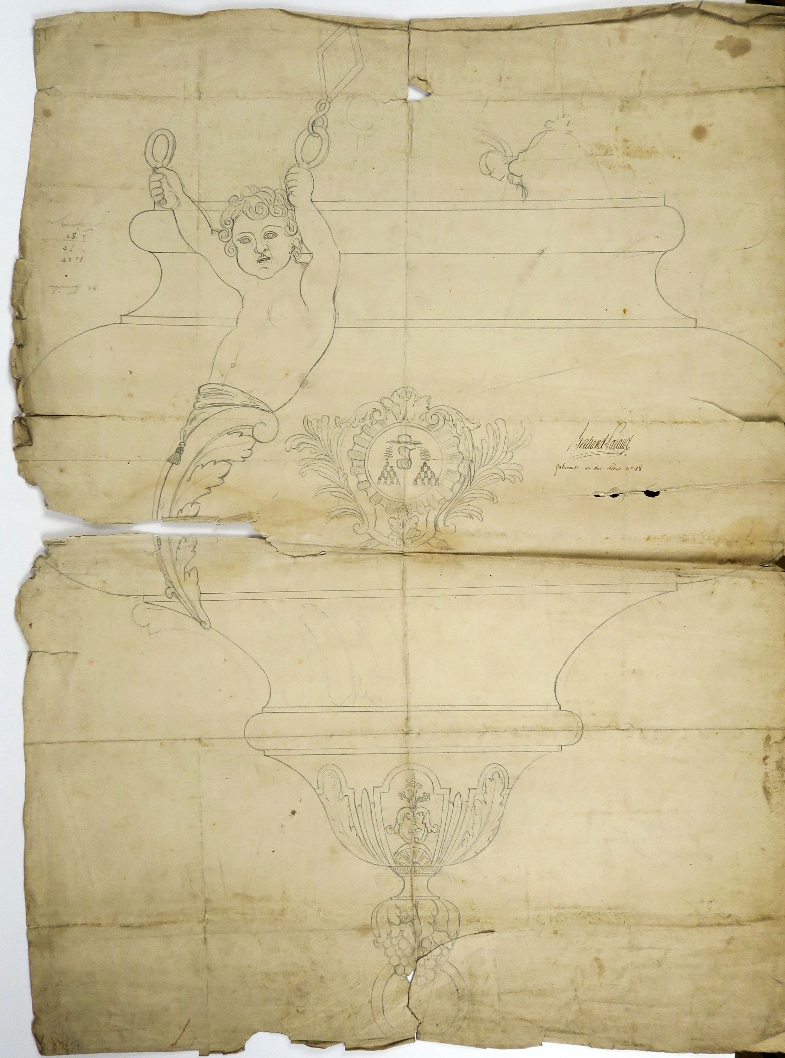 Ecole française XIXème « Projet de lampe de sanctuaire, à décor d’angelots » Dessin. 31 x 43 cm (petite déchirure) Bertrand PARAUD orfèvre « Projets de lampes de sanctuaires » Ensemble de 4 dessins sur papier ou papier cartonné. Signés 31.5 x 20 cm 41 x 22.5 cm 47 x 33 cm 58 x 44 cm 84 x 63 cm (accidents) Ecole française première moitié du XIXème « Projets de lampes de sanctuaires » Ensemble de 6 dessins sur papier ou papier cartonné. (état moyen)