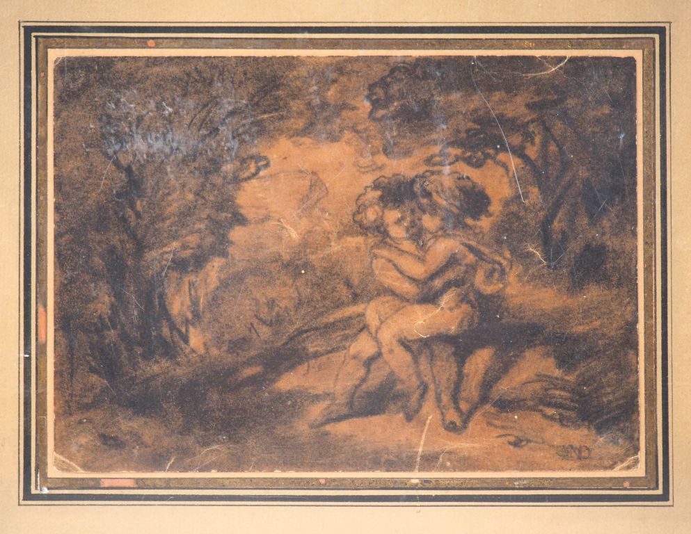 Ecole française XIXème. "Puttis enlacés". Dessin monogrammé "ND" en bas à droite. Dim. (à vue) : 12 x 17 cm.