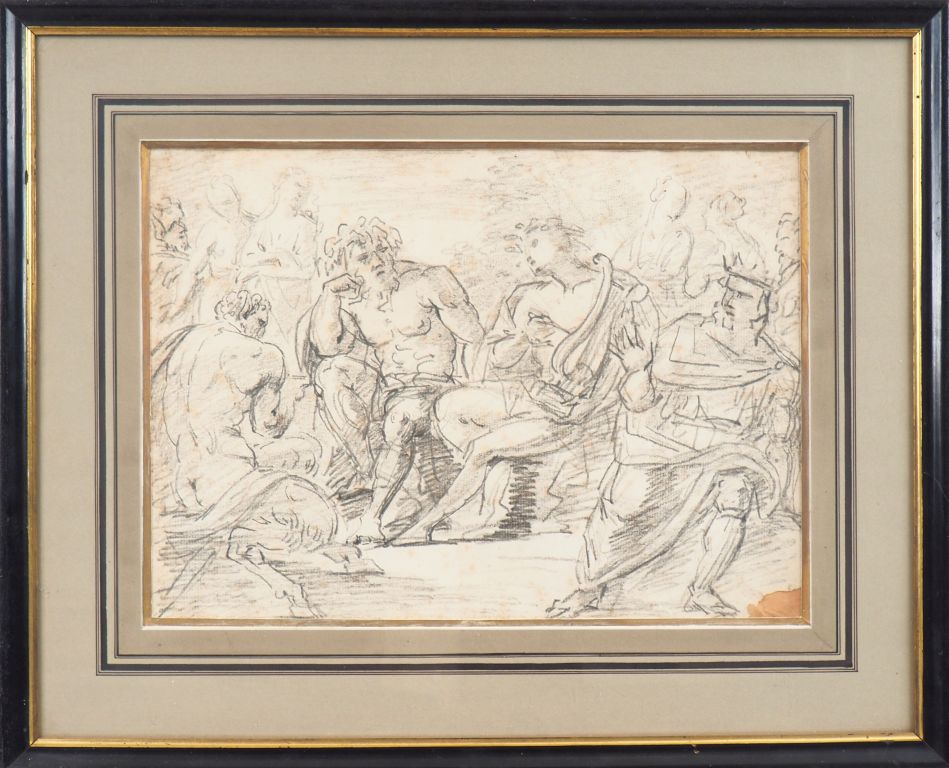 Ecole française XVIIIème. "Discussion sur l'Olympe". Dessin. Dim. 27,5 x 38 cm. (Petit manque en bas à droite).