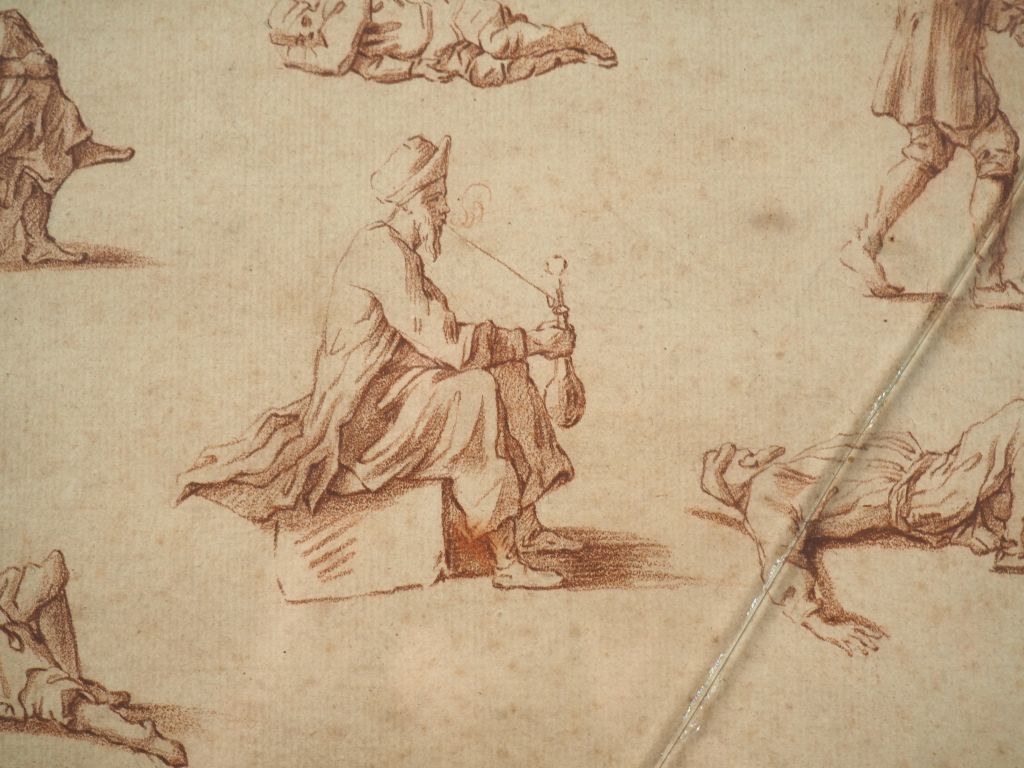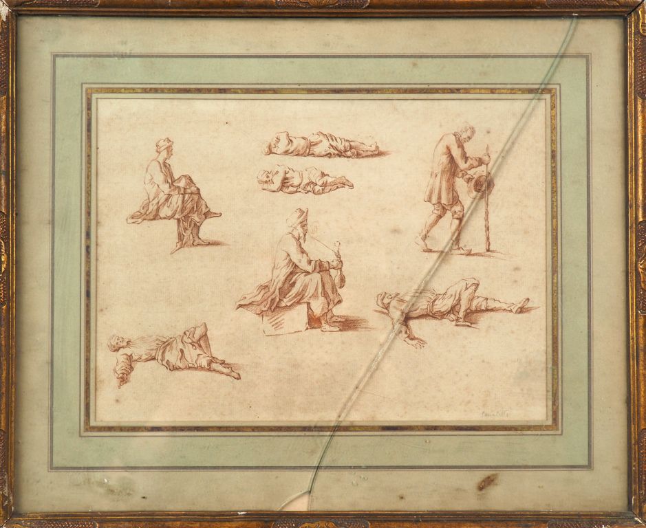 Ecole française XVIIIème. "Etudes de personnages". Sanguine, porte une signature apocryphe Dim. (à vue) : 19,5 x 28 cm.