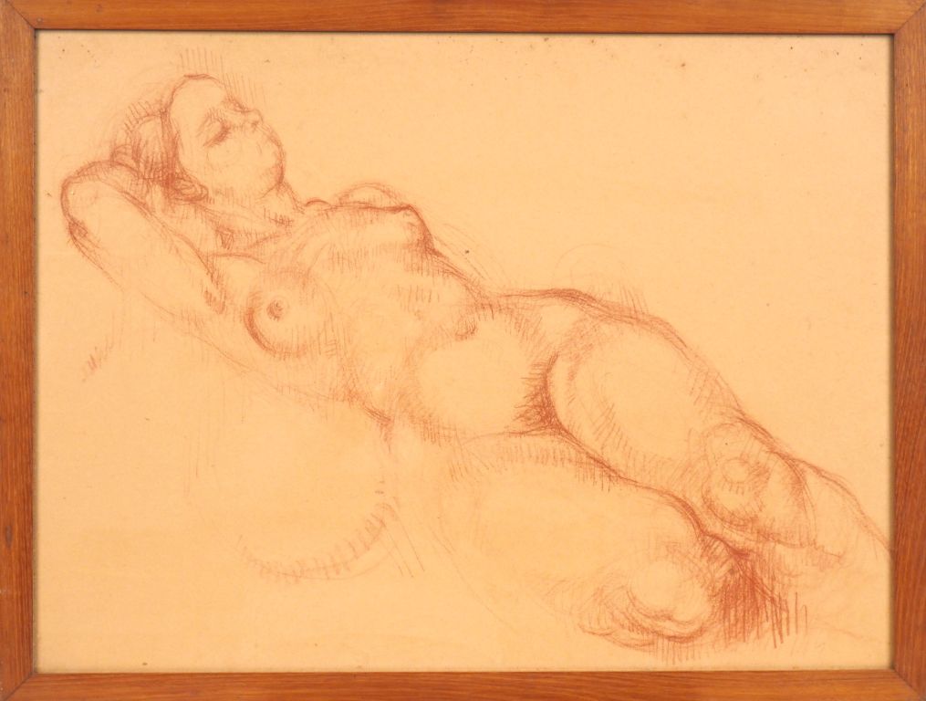 Ecole française Xxème. "Femme nue allongée". Dessin à la sanguine. Dim. 46,5 x 53 cm.