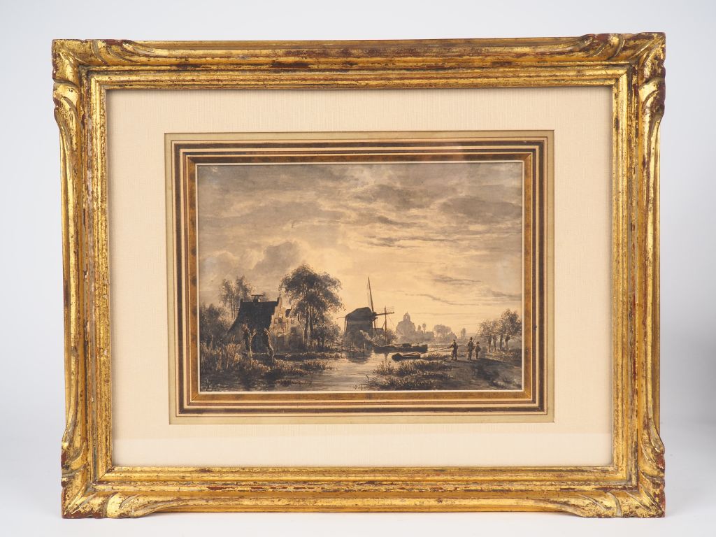 Ecole hollandaise XIXème. "Pêcheurs au bord de la rivière devant un moulin". Dessin aquarellé. Dim. 14,5 x 20,5 cm
