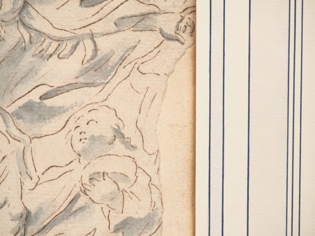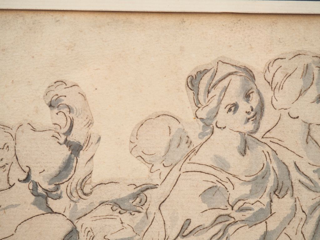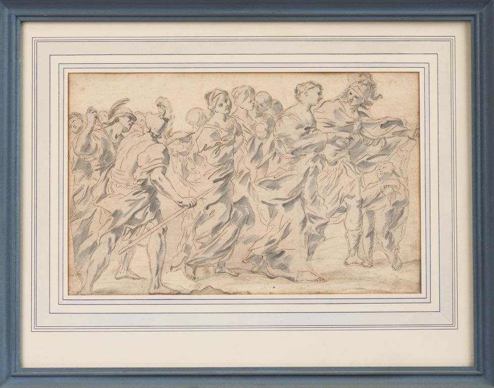 Ecole italienne XVIIème. "Femmes et soldats de l'antiquité". Dessin et lavis. Dim. 25 x 40 cm.