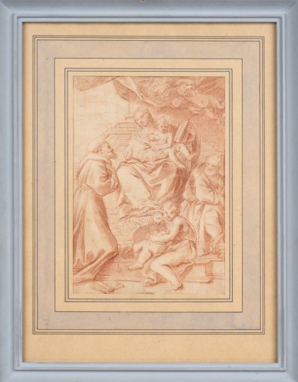 Ecole italienne XVIIIème. "Scène religieuse". Dessin à la sanguine, porte une signature apocryphe "BERETTONI". Dim. 25,5 x 18 cm.