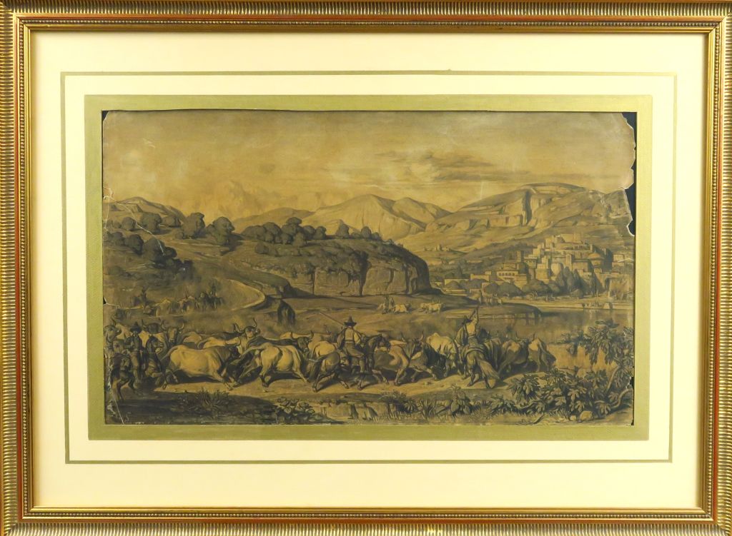 Ecole provençale ou italienne XIXe. "Manadiers et leur troupeau". Dessin. Dim. 32,5 x 54,5 cm (déchirures)
