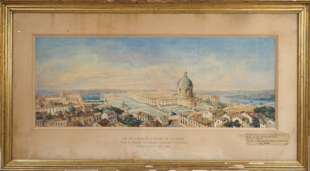 Ecole toulousaine fin XIXème Oeuvre commune de Jean Paul Laurens, Gilles Lacassin et Constantin "vue de l'hospice St Joseph de la Grave" Aquarelle signée et datée 1889 Il est écrit sur une étiquette d'époque : "la valeur de cette œuvre est surtout dans la collaboration des artistes Jean Paul Laurens (ciel et lointains), dessin de J. Lacassin, aquarelle de Constantin, ex professeur de Mademoiselle de Mac Mahon). Signée en bas à droite. Dim. À vue : 37,5 x 100 cm
