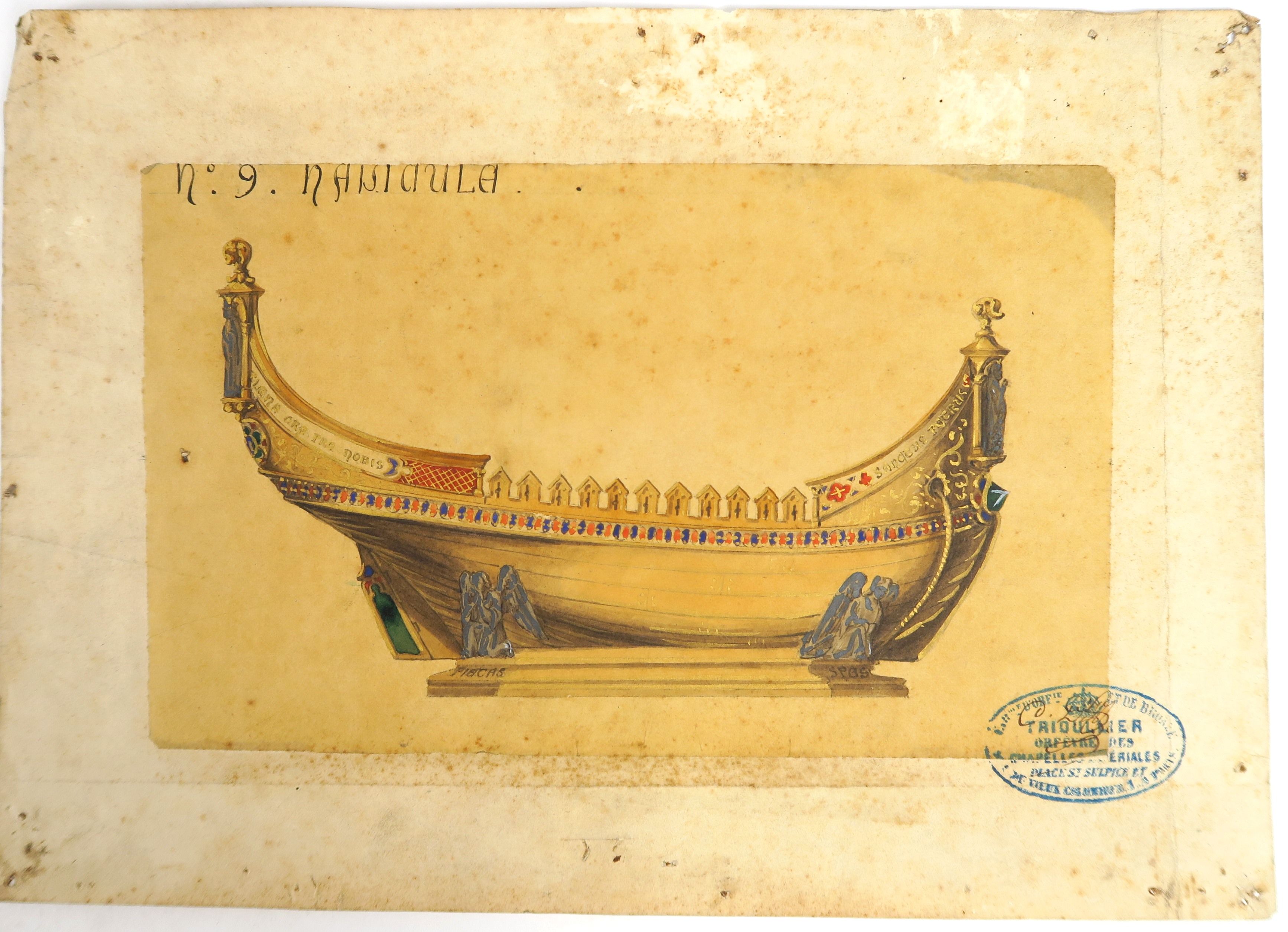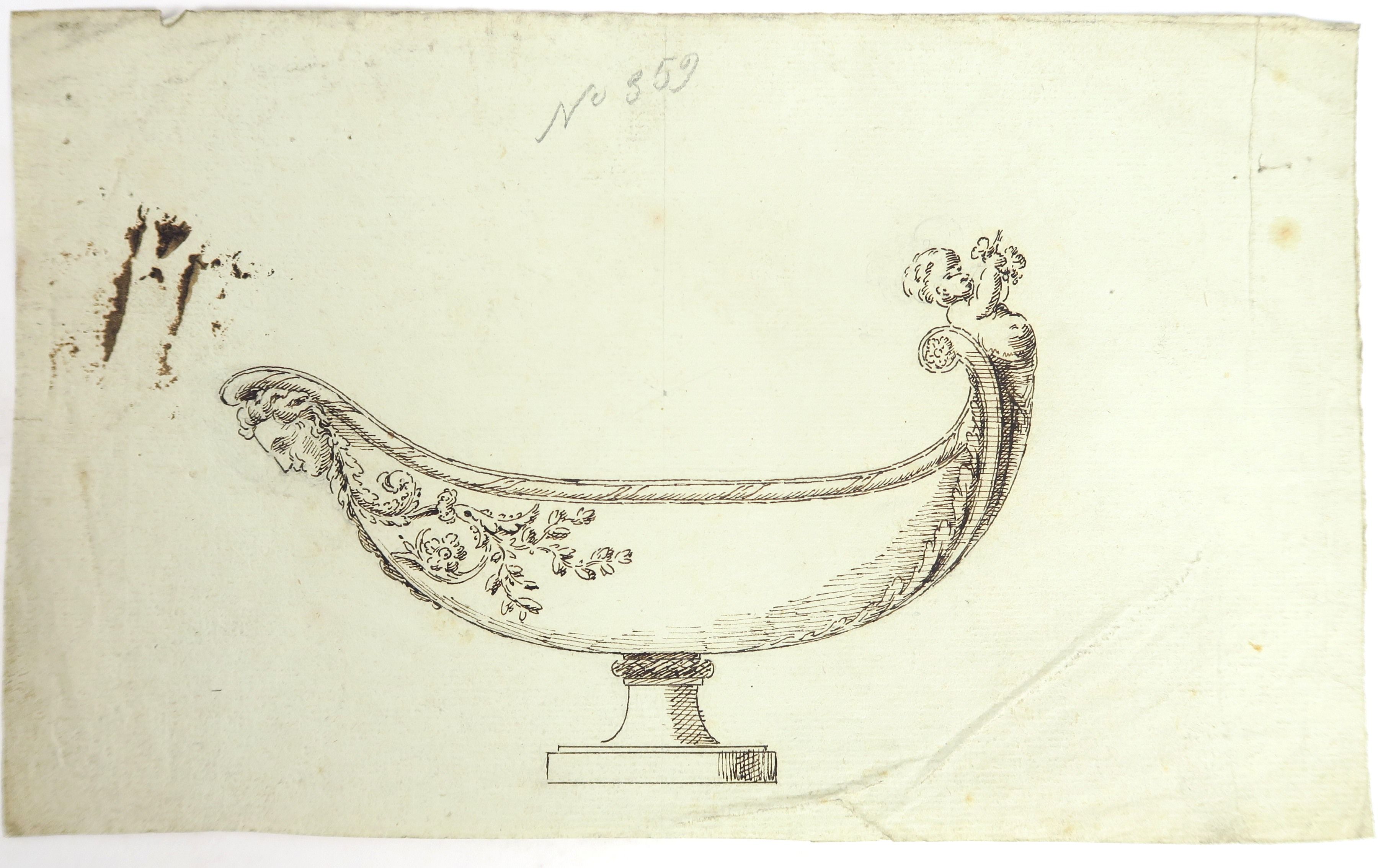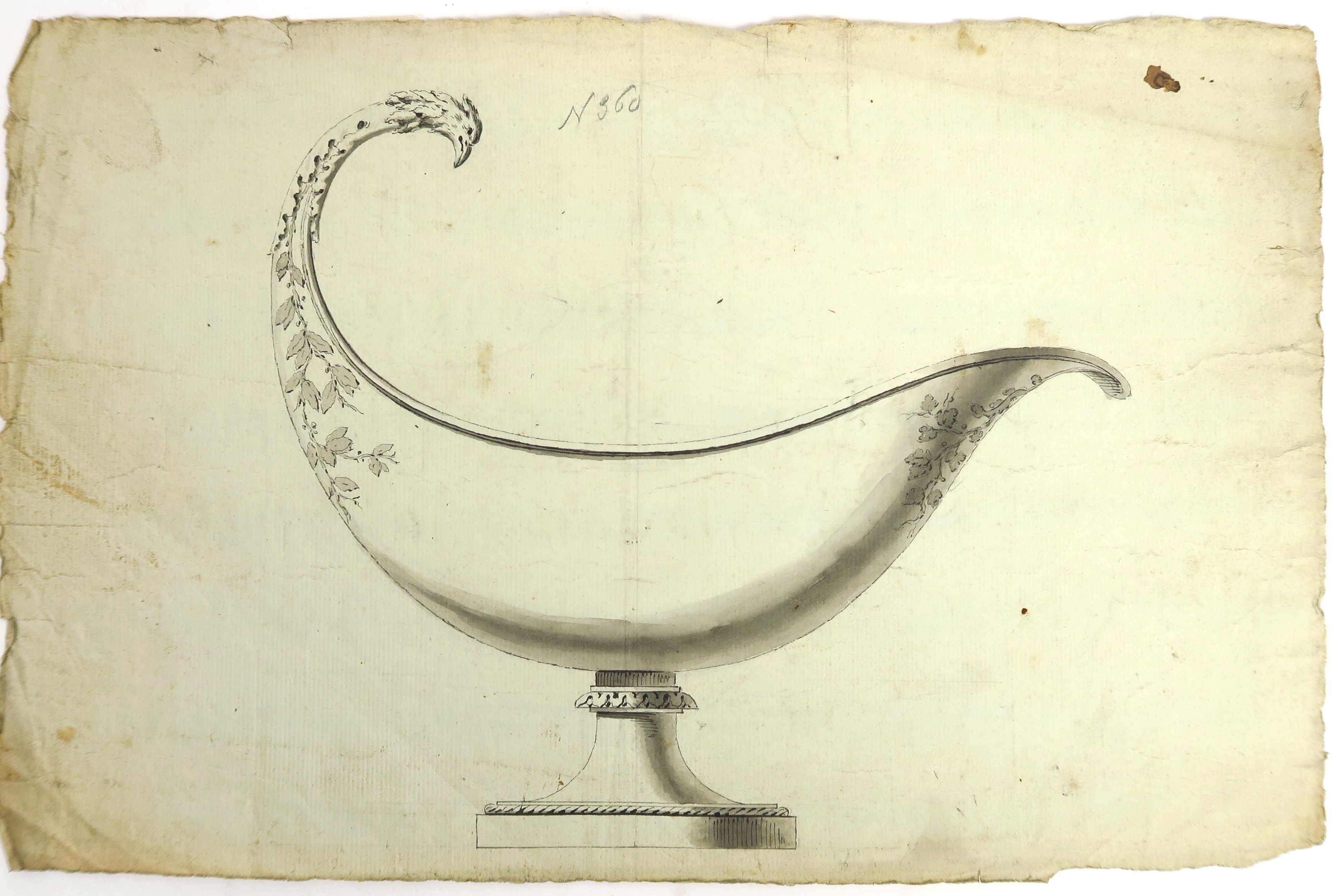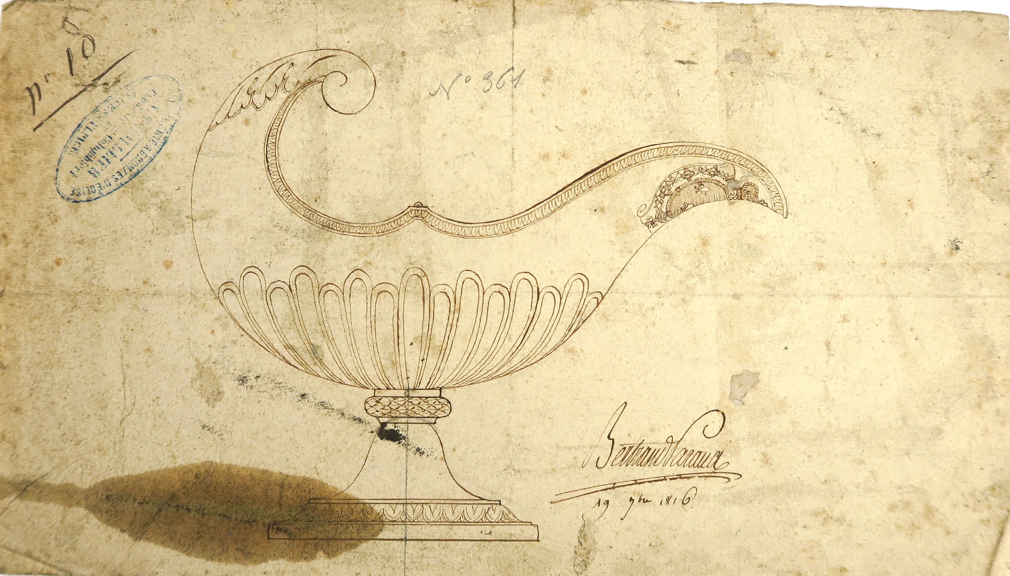 Ecoles françaises début XIXème « Projets de saucières » Ensemble de 12 dessins dont 3 calques (un en couleur portant le cachet de l’atelier de TRIOULLIER). Un dessin signé Bertrand PARAUD.