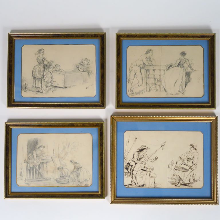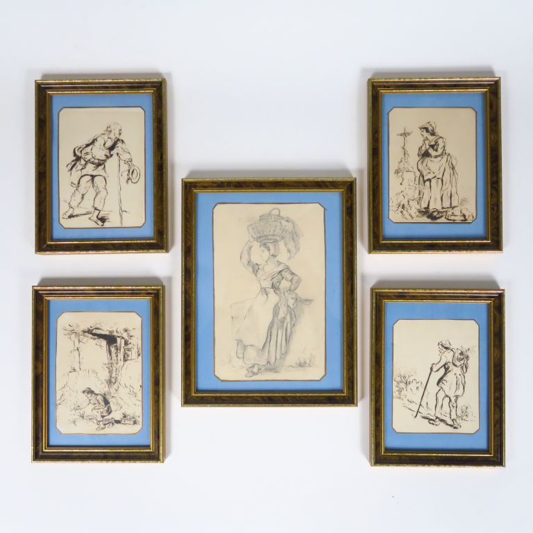 Ensemble de 13 dessins au crayon et à la plume et un carnet de croquis XIXème "Etude de personnages".