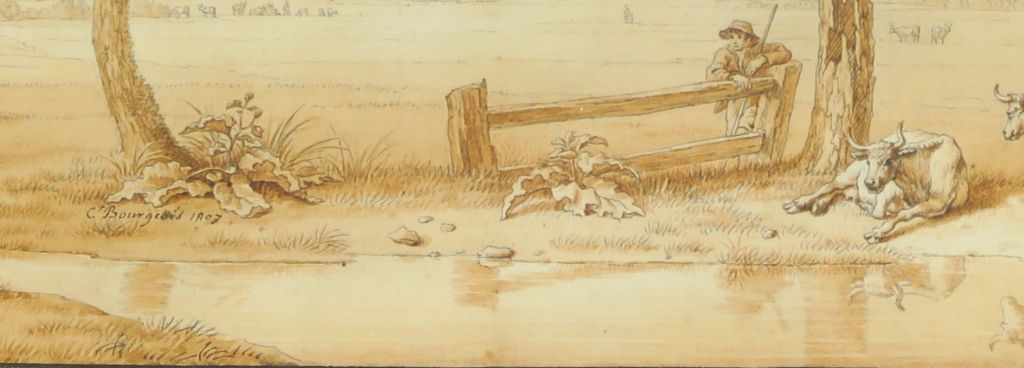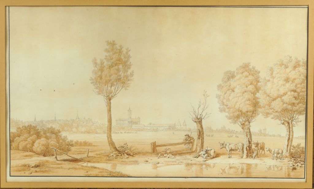 Florent Fidèle Constant BOURGEOIS de CASTELET (Guiscard 1767-1841) "Berger et son troupeau au bord de l’eau devant la ville de Malbork (Marienbourg)" Plume et encre noire, lavis brun sur traits de crayon noir 27,7 x 48 cm Signé et daté « C.Bourgeois 1807 » en bas au centre Un dessin préparatoire à ce lavis et comportant le numéro « 400 » au crayon bleu est conservé au musée de Versailles, châteaux de Versailles et de Trianon (invdessins183 , RF24146) Légèrement insolé, petites taches Expert : Cabinet de Bayser