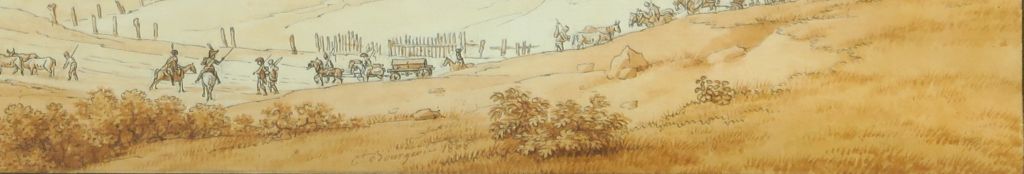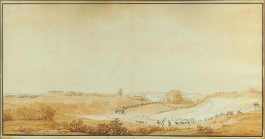 Florent Fidèle Constant BOURGEOIS de CASTELET (Guiscard 1767-1841) "L’arrivée du convoi à Hoff, 6 février 1807" Plume et encre noire, lavis brun sur esquisse au crayon noir 30 x 58,5 cm Signé et daté « Ct Bourgeois 1808 » en bas à droite Numéroté en bas à droite au crayon bleu « 405 », ce numéro correspondant à celui inscrit sur le dessin préparatoire dans l’album. Situé et daté au verso : « Hoff, 6 février 1807 l’autre partie se trouve avec l’esquisse du combat de Manungen » Légèrement insolé, petites taches, trace de pliure centrale verticale Expert : Cabinet de Bayser