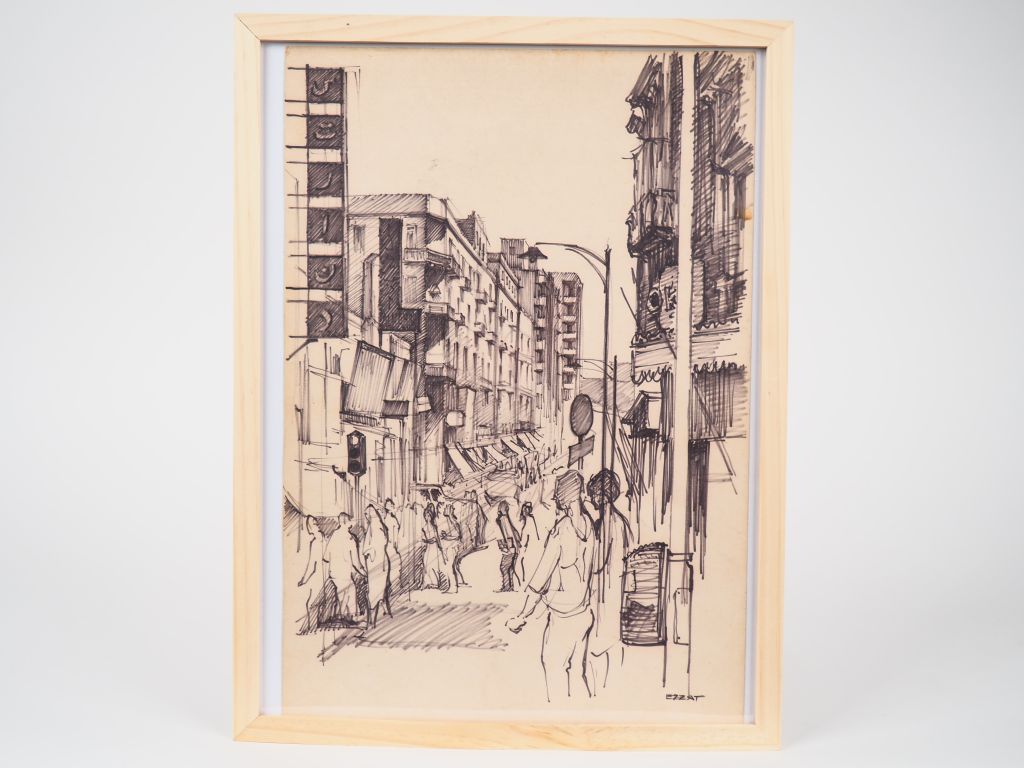 Ibrahim EZZAT. "Au coin de la rue Sofia-Zaghloud". Dessin, signé en bas à droite, daté au dos 1965. Dim. (à vue) : 39 x 26,5 cm.
