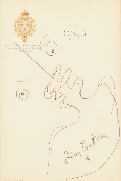 Lot de Jean COCTEAU. Dessin au feutre sur un menu. Signé en bas à droite. Dim au prix de 600 à 800 € en vente aux enchères par l'hôtel des ventes Primardeco