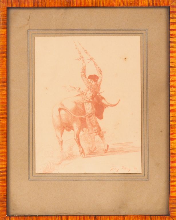 Jean PALUN. "Fioriture aux banderilles. Sanguine, signée et datée en bas à droite, titrée au dos. Dim. (à vue) :20,5 x 15,5 cm.