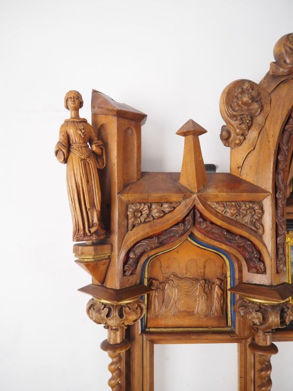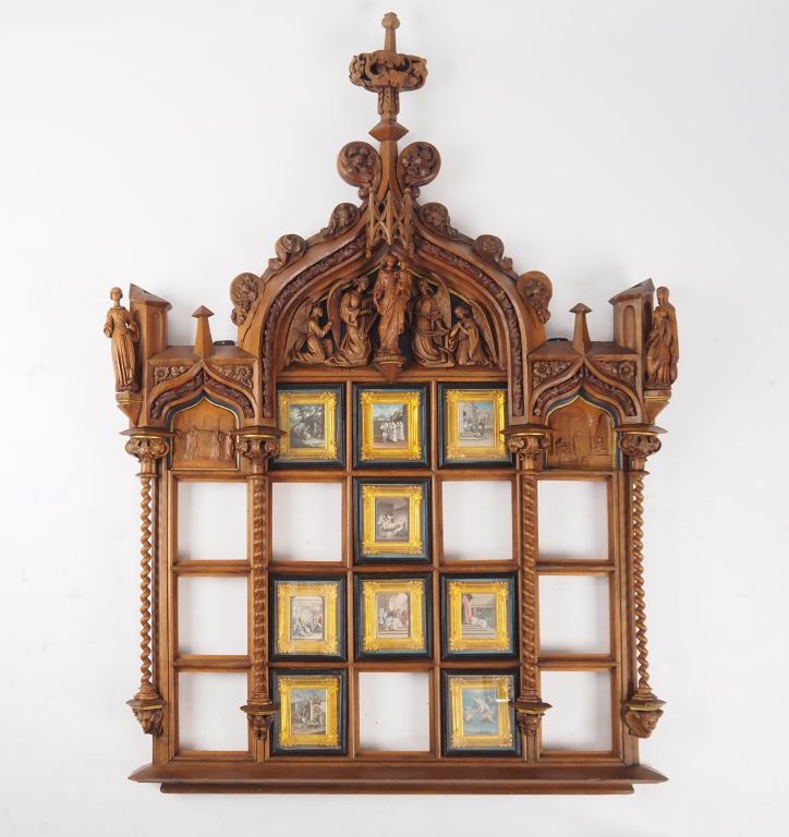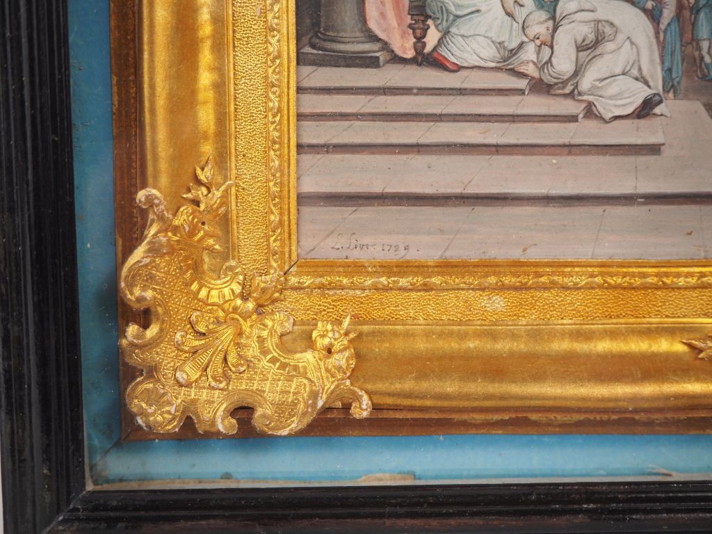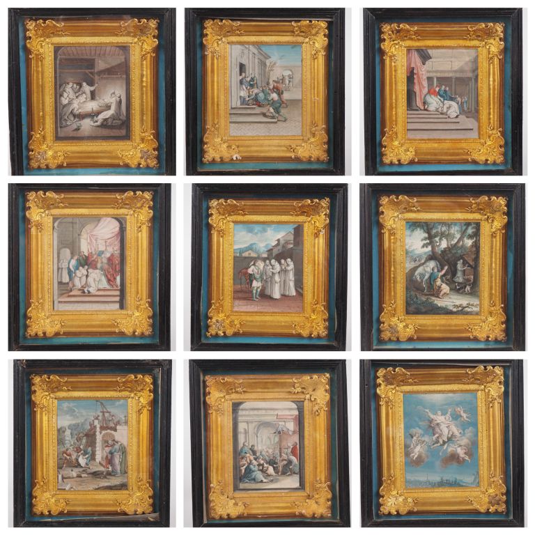 Louis LIOT. "Vie de Saint Bruno". Suite de 9 aquarelles, personnages en léger relief, dans des encadrements en laiton doré sous verre, enchassées dans un haut de retable Napoléon III de style Haute époque à décor sculpté. Signées et datées 1729. (Manques). Dim. (aquarelles à vue) : 9 x 7 cm. Dim. (totale) : 150 x 105 cm