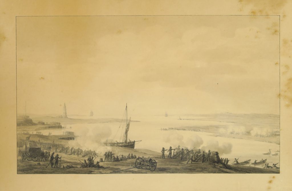 Louis-Philippe CREPIN (1772-1851) "Les positions militaires à Travemünde (port de Lübeck)" Plume et encre noire, lavis gris sur traits de crayon noir 22,5 x 37 cm Signé « LP.Crépin » en bas à gauche Numéroté au crayon bleu « 390 » en bas à droite, ce numéro correspondant à celui inscrit sur le dessin préparatoire dans l’album (sur lequel est inscrit le nom de Crépin). Annoté au verso sur l’encadrement « Travemunde (port de Lubeck), les barques vont chercher les Français » Légèrement insolé, petites taches Expert : Cabinet de Bayser