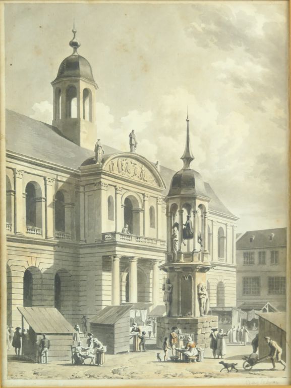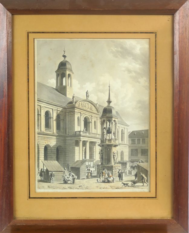 Louis-Pierre BALTARD (1764-1846) "Vue du monument et de la statue équestre de l’empereur Othon sur la grand-place de Magdebourg" Lavis gris et aquarelle sur esquisse au crayon noir 29,5 x 22,5 cm Trace de signature « Baltard delt» en bas à gauche et situé « Magdebourg » au crayon noir en bas à droite. Numéroté au crayon bleu « 385 » en bas à droite. Un dessin préparatoire à ce lavis et comportant le même numéro « 385 » au crayon bleu est conservé au musée de Versailles, châteaux de Versailles et de Trianon (invdessins169 , RF24139) Légèrement insolé Expert : Cabinet de Bayser