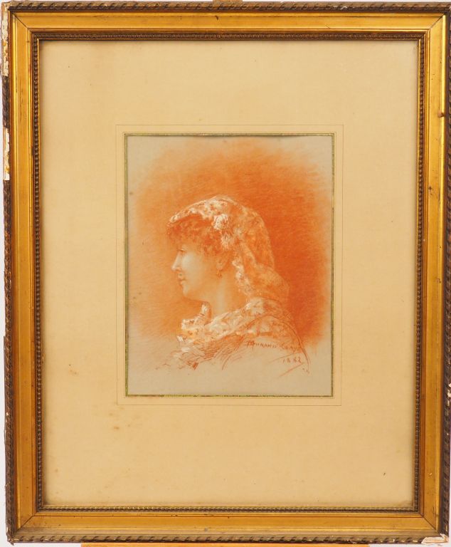 M. DURAND CLAYE. « Portrait de jeune femme de profil » Dessin à la sanguine rehaussée de craie. Signé en bas à droite et daté 1882. Dim. 29 x 22.5 cm