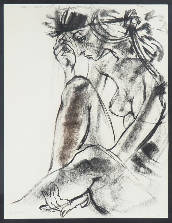 Maurice MELAT. "Jeune fille accroupie". Dessin signé en bas à gauche et daté 1970. Dim. À vue : 66 x 50 cm.