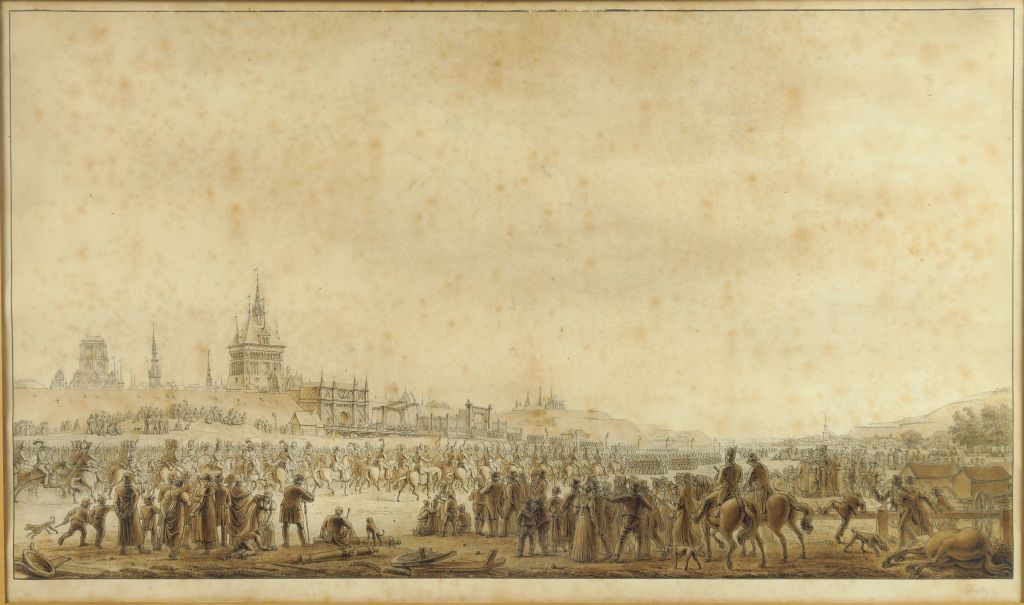 Nicolas-Antoine TAUNAY (1755-1830) "L’arrivée de l’Empereur à Dantzig le 27 mai 1807" Plume et encre noire, lavis brun sur esquisse au crayon noir 35,8 x 63 cm Numéroté en bas à droite au crayon bleu et à la plume « 424 », ce numéro correspondant à celui inscrit sur les dessins préparatoires dans l’album (un de ces dessins porte l’inscription « rapporté par Taunay »). Situé au crayon noir en bas à droite : « Dantzig » Situé et daté au verso : « arrivée de l’Empereur à Dantzig 27 mai 1807 » Insolé, nombreuses rousseurs Expert : Cabinet de Bayser