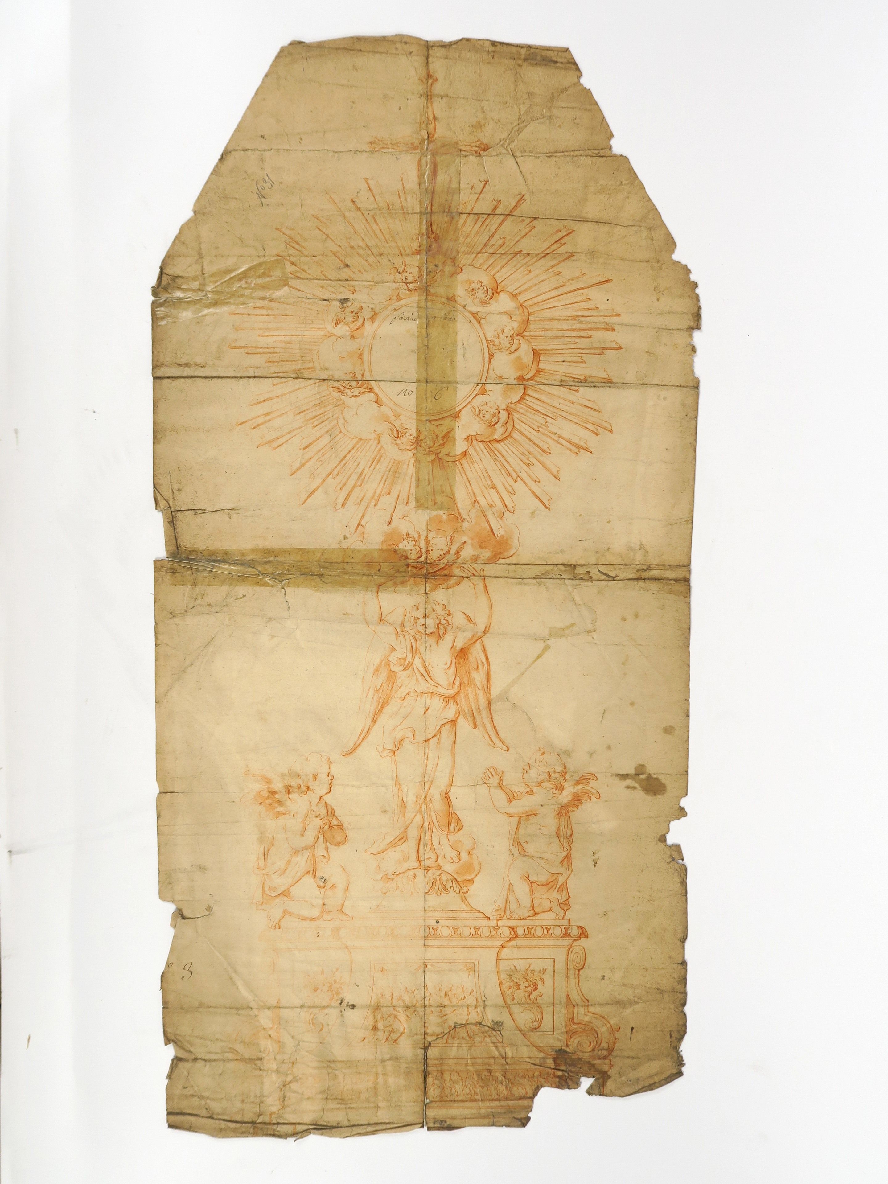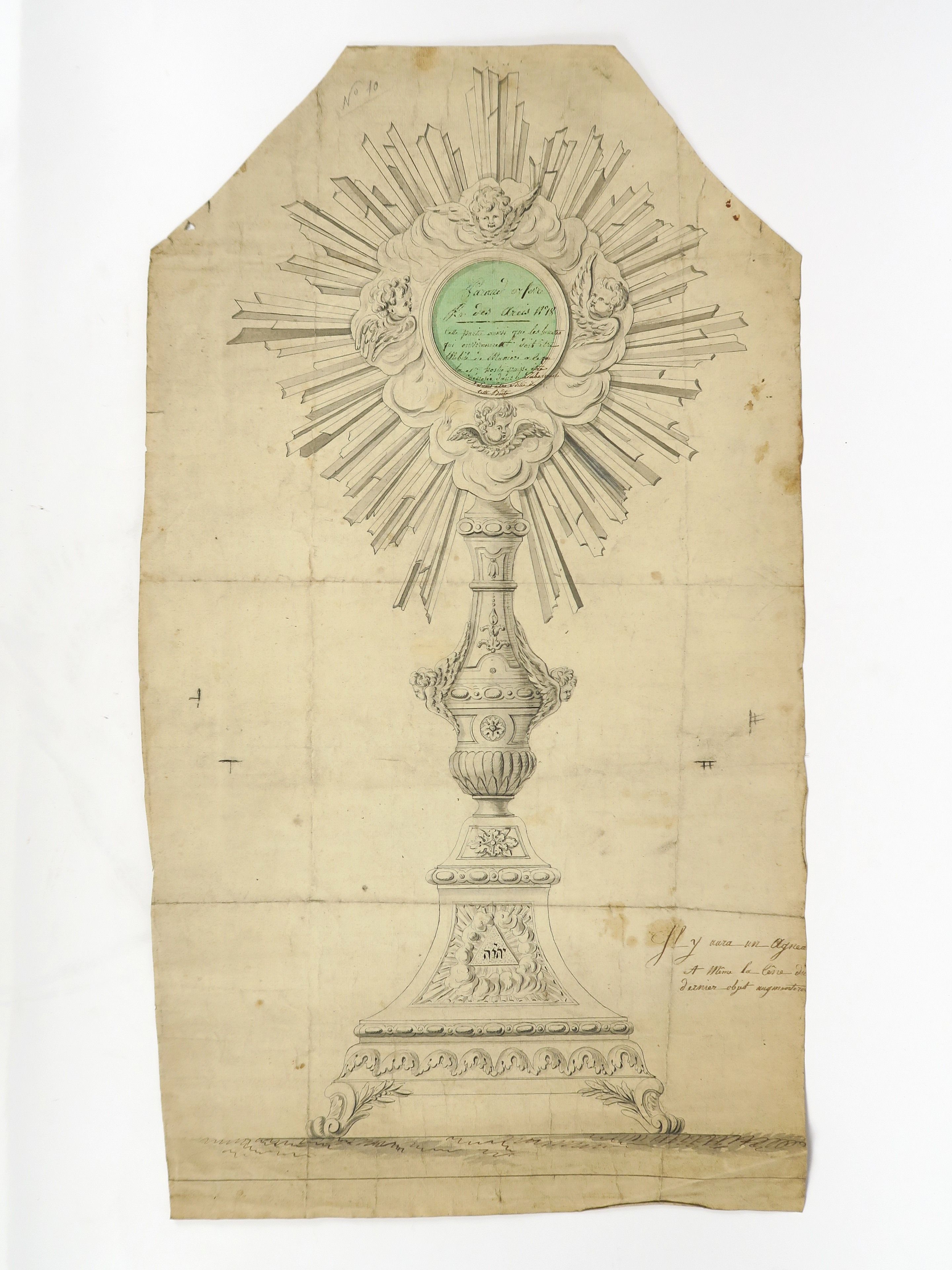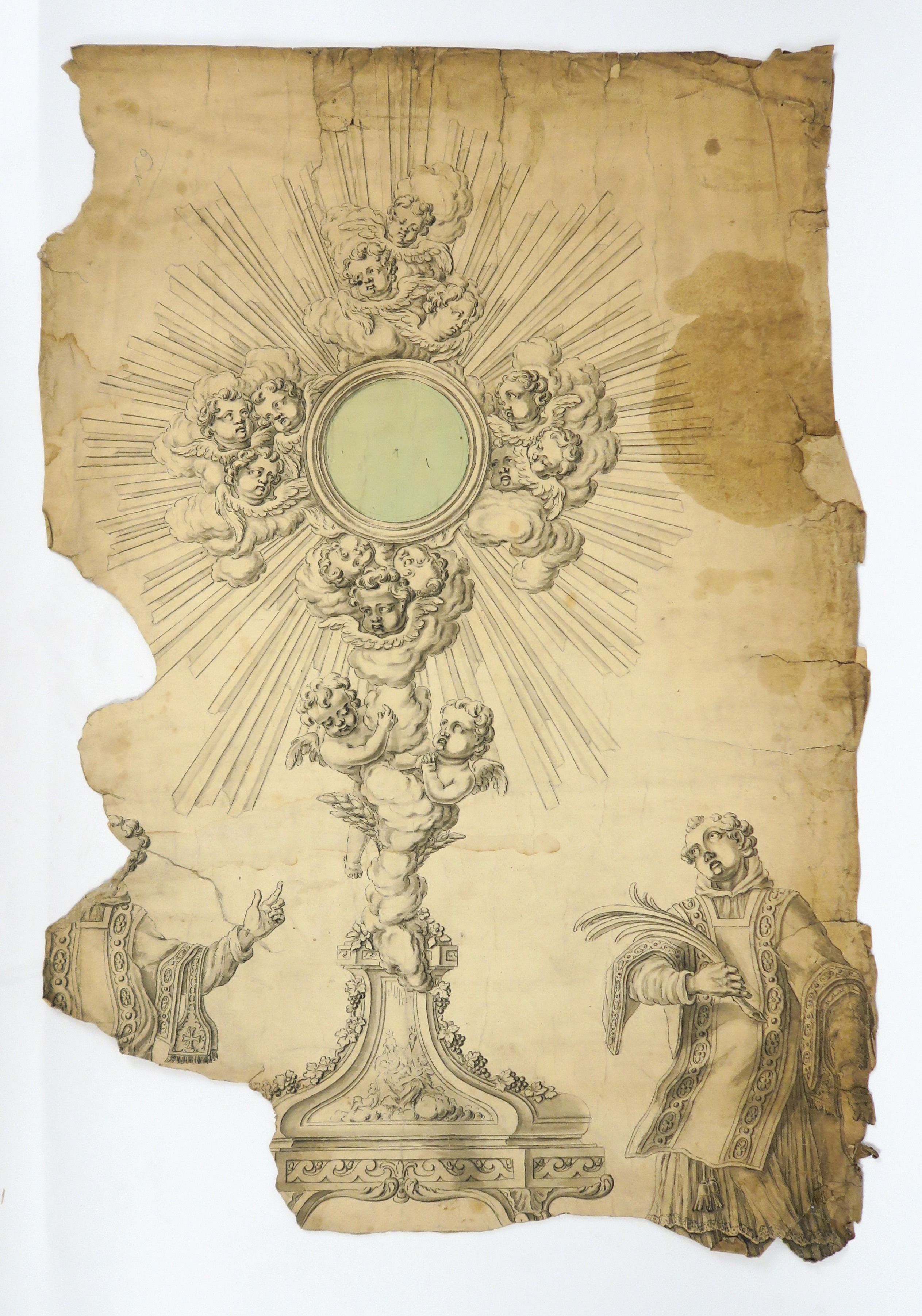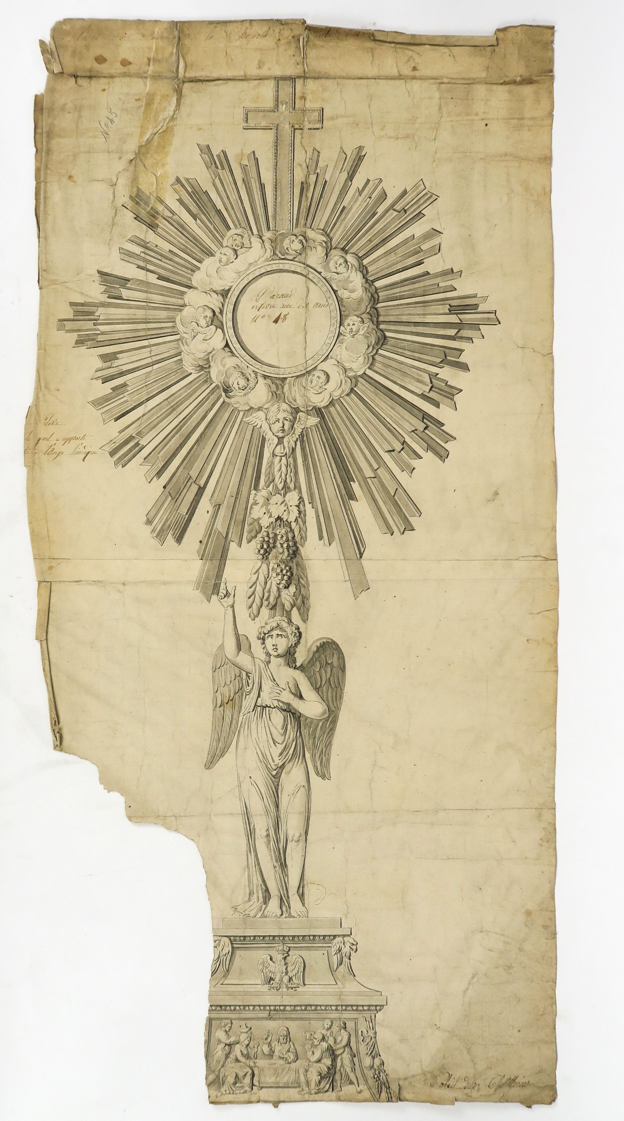 PARAUD orfèvre « Projets d’ostensoirs » Ensemble de dessins à la sanguine et au lavis. (divers états) PARAUD orfèvre « Projet d’ostensoir : Le soleil des Thuilleries » Dessin au lavis. Signé. 89 x 43.5 cm (manques et accidents) PARAUD orfèvre « Projet pour un ostensoir, à décor d’angelots » Dessin à la sanguine. Signé. 80 x 39 cm (accidents) PARAUD orfèvre « Projet d’ostensoir » Dessin au lavis. Signé. 74 x 42 cm (état moyen) Ecole française « Fragment d’un projet d’ostensoir » Dessin au lavis. 78 x 53 (manques) PARAUD orfèvre « Projet d’un ostensoir pour la cathédrale d’Orléans » Dessin au lavis. Signé. 96.5 x 54 cm (accidents) Ecole française « Projet d’ostensoir soleil » Dessin au lavis marouflé sur papier. 87.5 x 47.5 cm (état moyen)
