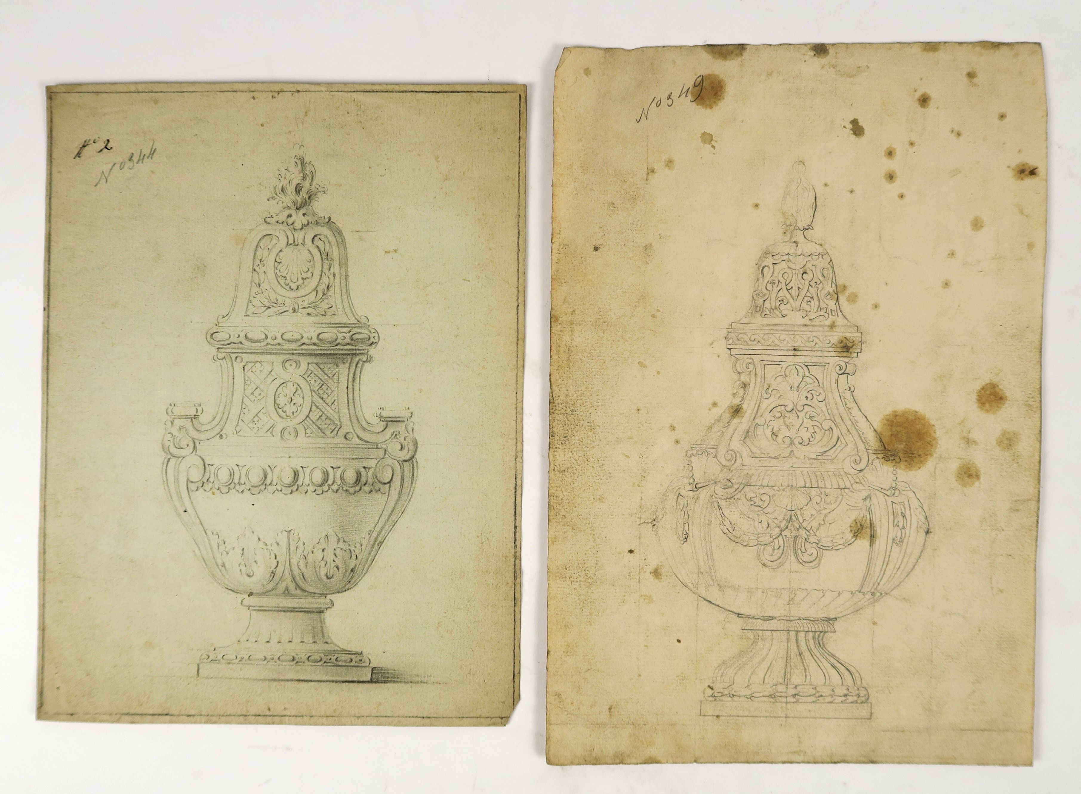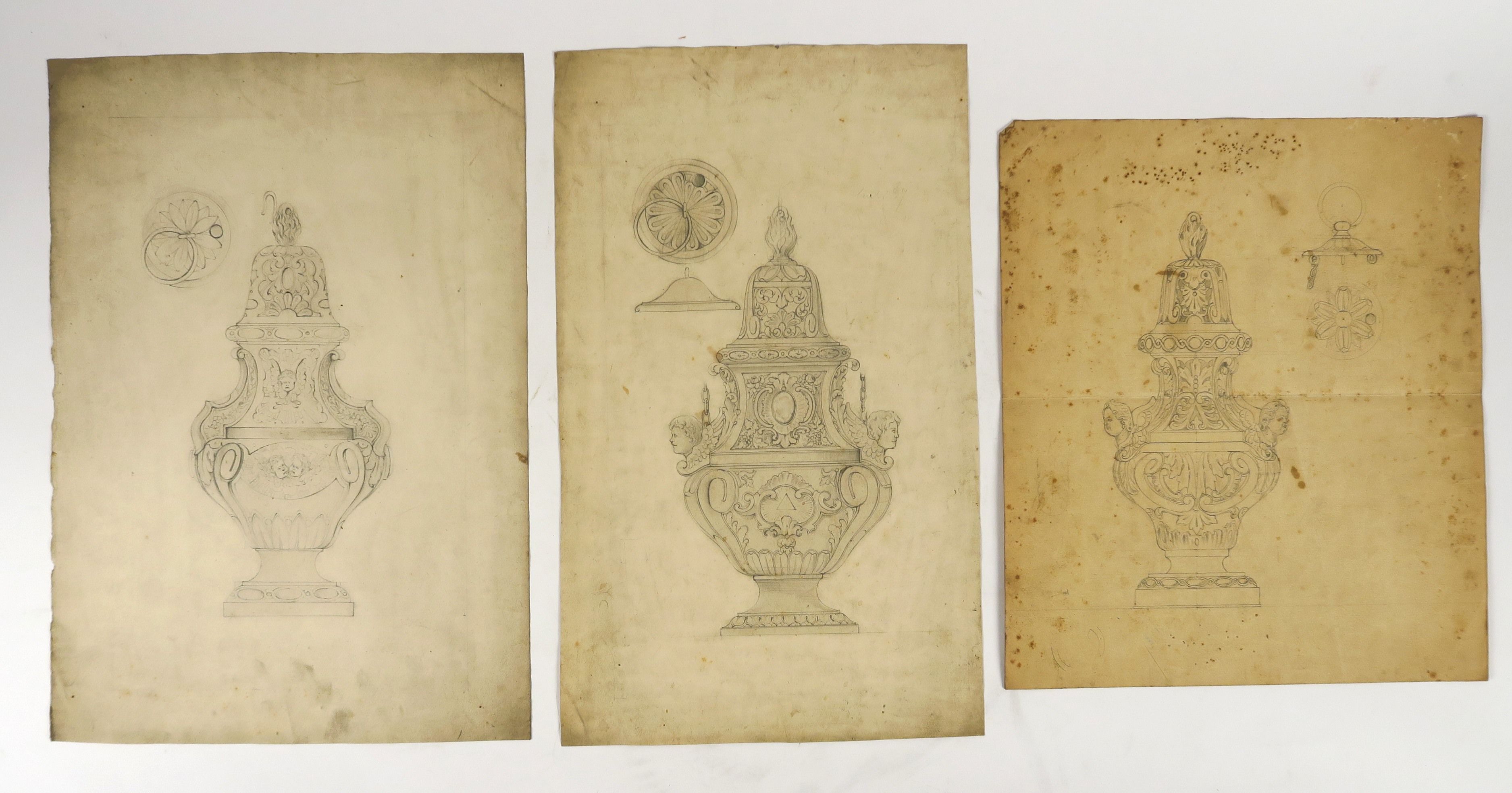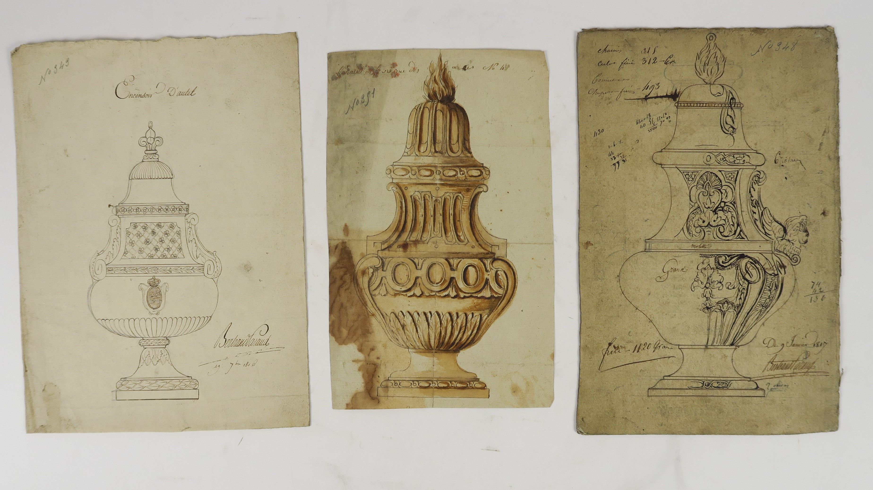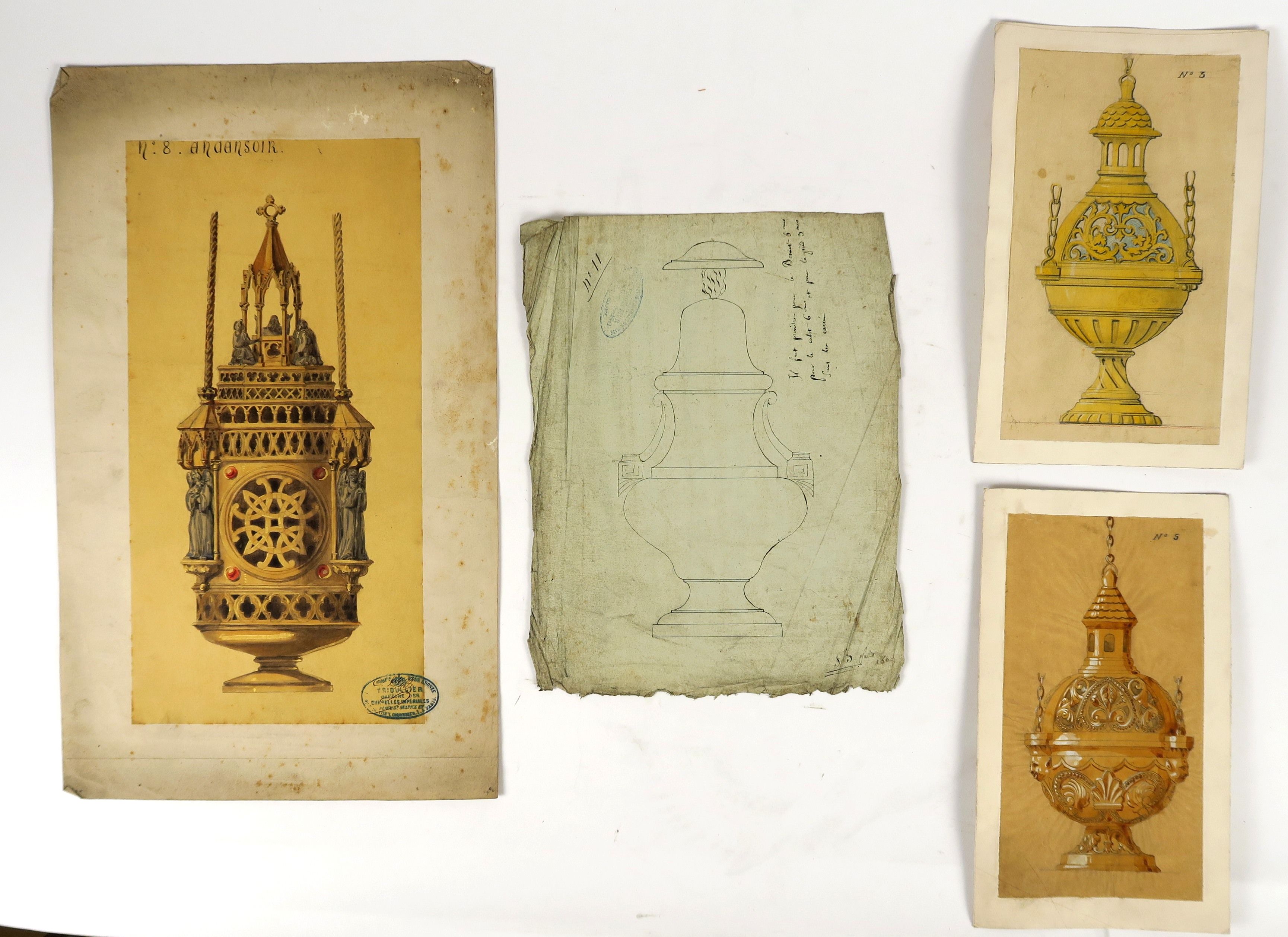 PARAUD orfèvre, « Projets pour des encensoirs » Ensemble de 3 dessins. Signés. 27.4 x 17 cm 31 x 20 cm 30 x 22 cm TRIOULLIER orfèvre « Projets d’encensoirs » Calque en couleur collé sur papier, dessin à la plume, signé. 31 x 23.5 cm 37.5 x 19 cm On y joint : MONTAGNIER, successeur de TRIOULLIER « Projets d’encensoirs » Deux calques en couleur, collés sur papier. 24.2 x 13.6 cm 24.1 x 12.6 cm Ecole française XIXème « Projets d’encensoirs » Ensemble de 11 dessins et calques.