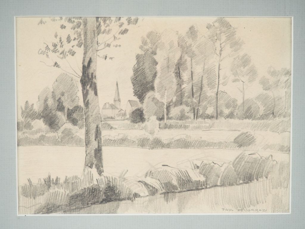 Paul DELORMOZ. "Paysage de l'Indre". Dessin au crayon, signé en bas à droite. Dim. à vue : 15 x 21,4 cm.