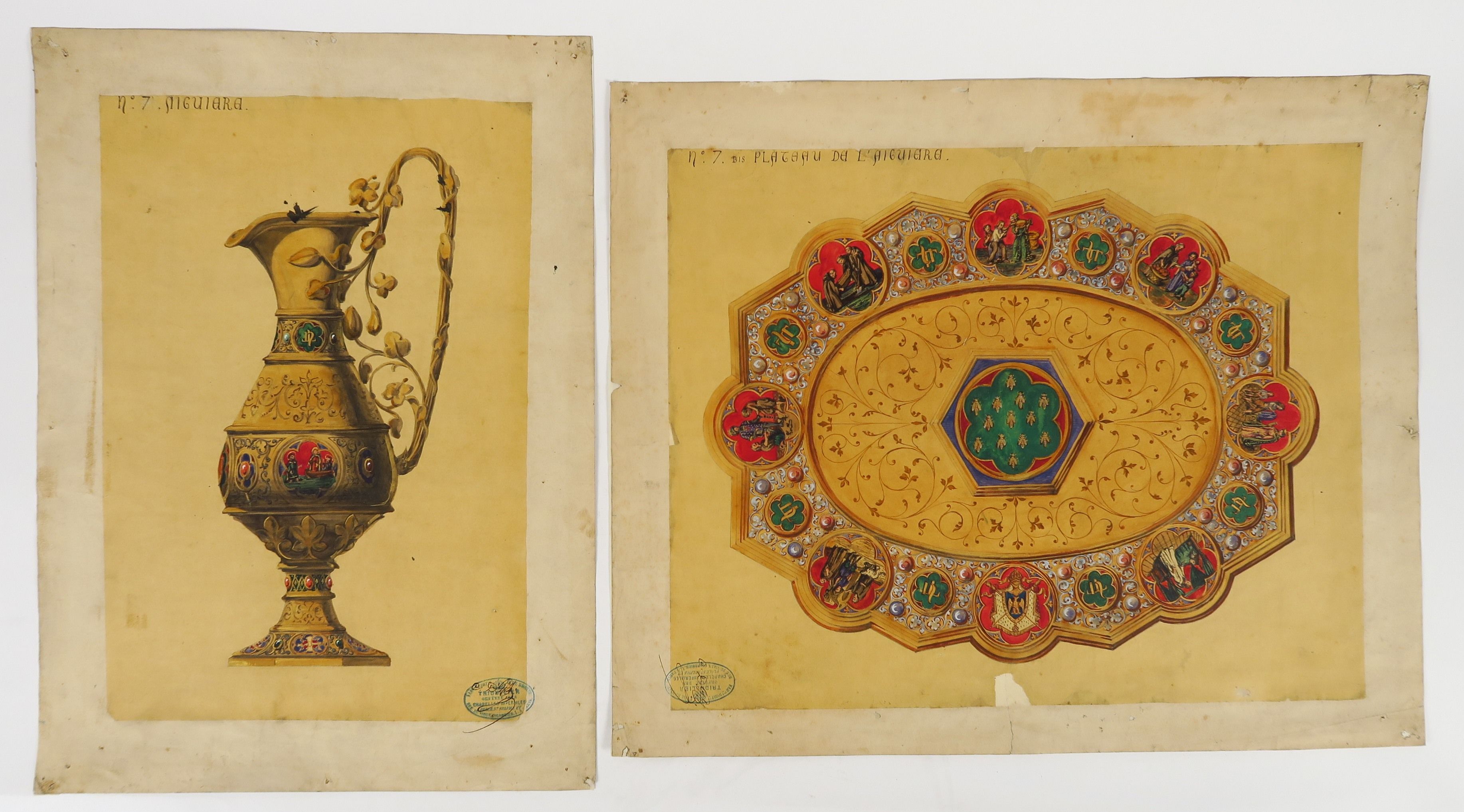 TRIOULLIER orfèvre, « Projet d’aiguière et son plateau » Deux calques en couleurs, collés sur papier. Numérotés 7 et 7.Bis. Dimensions des calques : 44 x 30 cm et 40 x 50.5 cm Signés (accidents et restaurations)