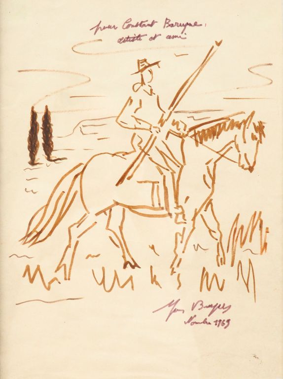 Yves BRAYER. "Le manadier". Dessin, signé en bas à droite daté 1969 et dédicacé. Dim.: 39,5 x 29 cm.