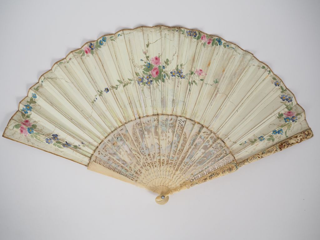 Eventail XVIIIème. Monture anglaise à 20 brins + 2 MB, en ivoire, sculptée, repercée, peinte et dorée. Cartouche central avec 4 personnages jouant avec un cerf volant, cartouches extérieurs avec un personnage. Maitres brins avec un jeune homme tenant un oiseau, une jeune fille tenant un tonnelet. Feuille gouachée d'une scène classique: "l'enlèvement d'Hélène". 29,5 cm CITES