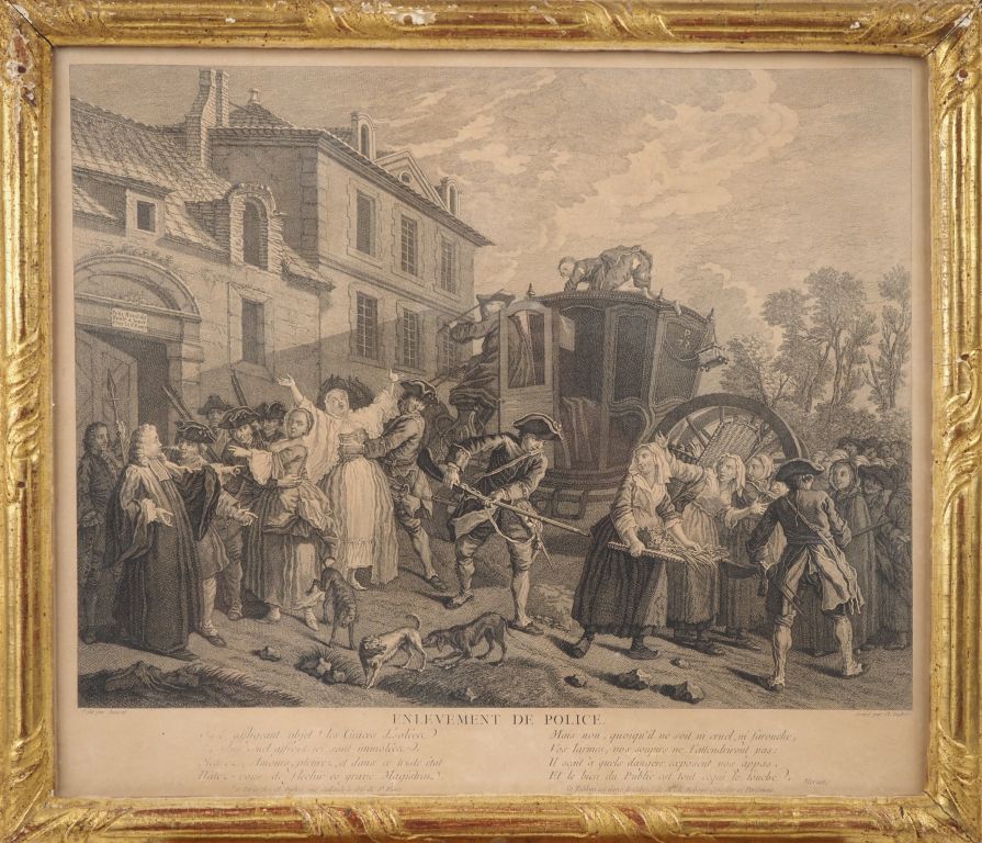 4 gravures de style Louis XVI dans des cadres à baguettes dorées "la place des halles" "la place Maubert", "enlèvement de police" "déménagement d'un peintre". Dim. des cadres : 41 x 46,5 cm