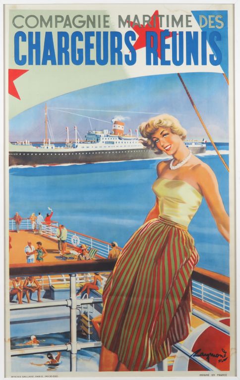 Affiche "Compagnie Maritime des chargeurs réunis". Signée RAYMOND. Affiche GAILLARD à Paris. (petites mouillures) Dim 98,5 X 61 cm.